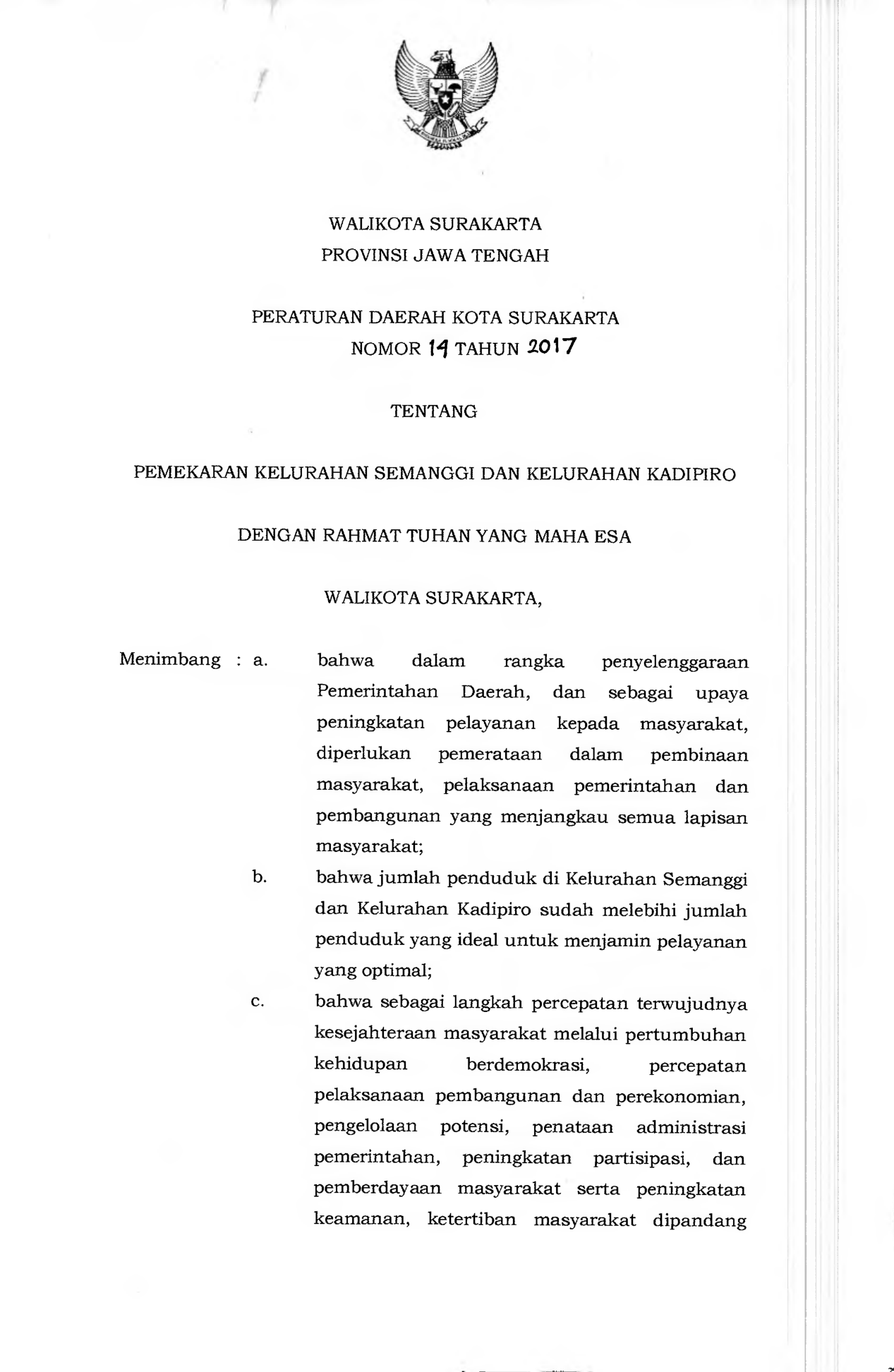 PERDA Nomor 14 Tahun 2017 | Peraturan Daerah Nomor 14 Tahun 2017 tentang Pemekaran Kelurahan Semanggai Dan Kelurahan Kadipiro