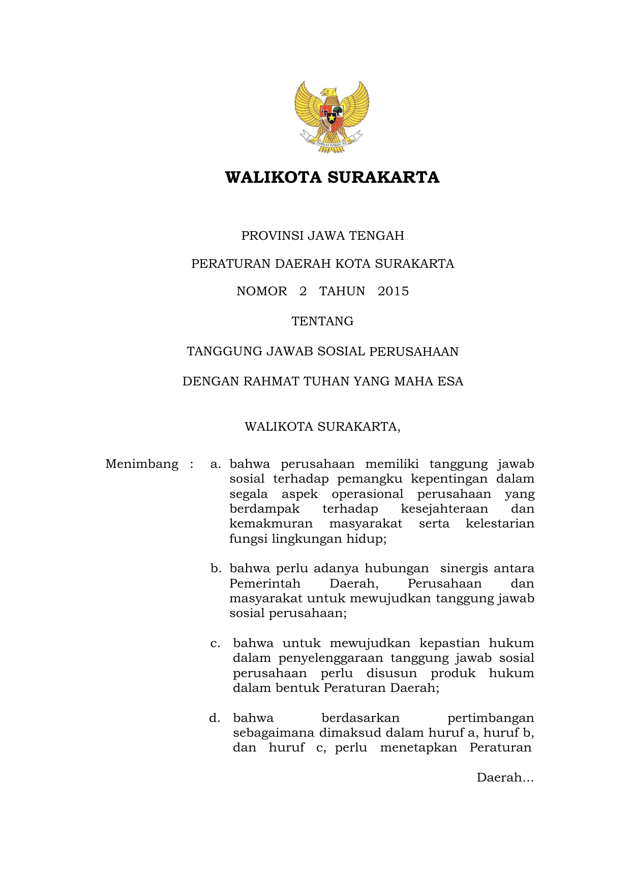 PERDA Nomor 2 Tahun 2015 | Peraturan Daerah Nomor 2 Tahun 2015 tentang TANGGUNG JAWAB SOSIAL PERUSAHAAN