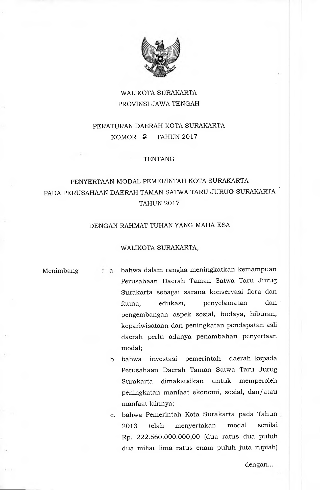 PERDA Nomor 2 Tahun 2017 | Peraturan Daerah Nomor 2 Tahun 2017 tentang PENYERTAAN MODAL PEMERINTAH KOTA SURAKARTAPADA PERUSAHAAN DAERAH TAMAN SATWA TARU JURUG SURAKARTA •TAHUN 2017