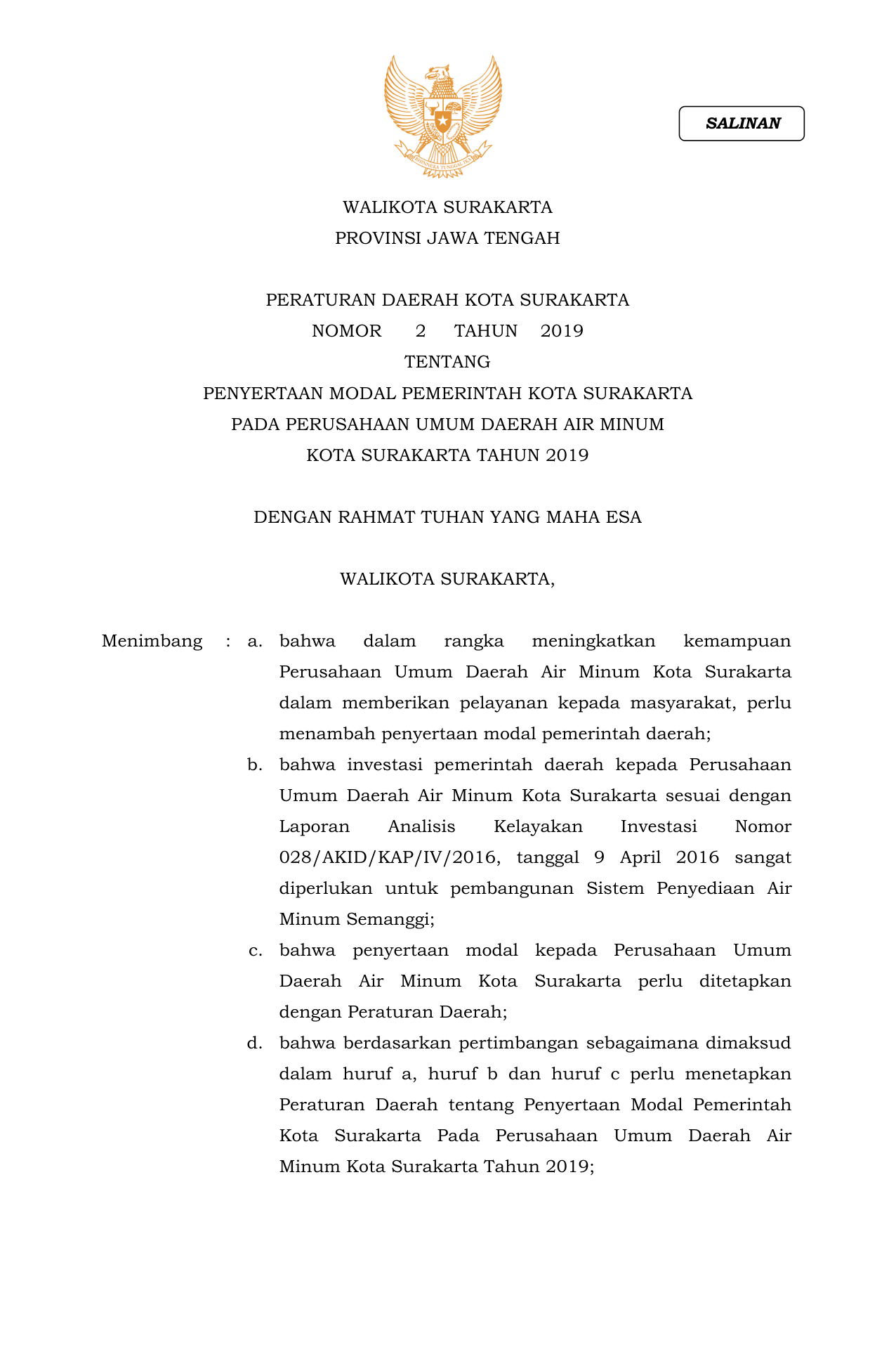 PERDA Nomor 2 Tahun 2019 | Peraturan Daerah Nomor 2 Tahun 2019 tentang PENYERTAAN MODAL PEMERINTAH KOTA SURAKARTAPADA PERUSAHAAN UMUM DAERAH AIR MINUMKOTA SURAKARTA TAHUN 2019