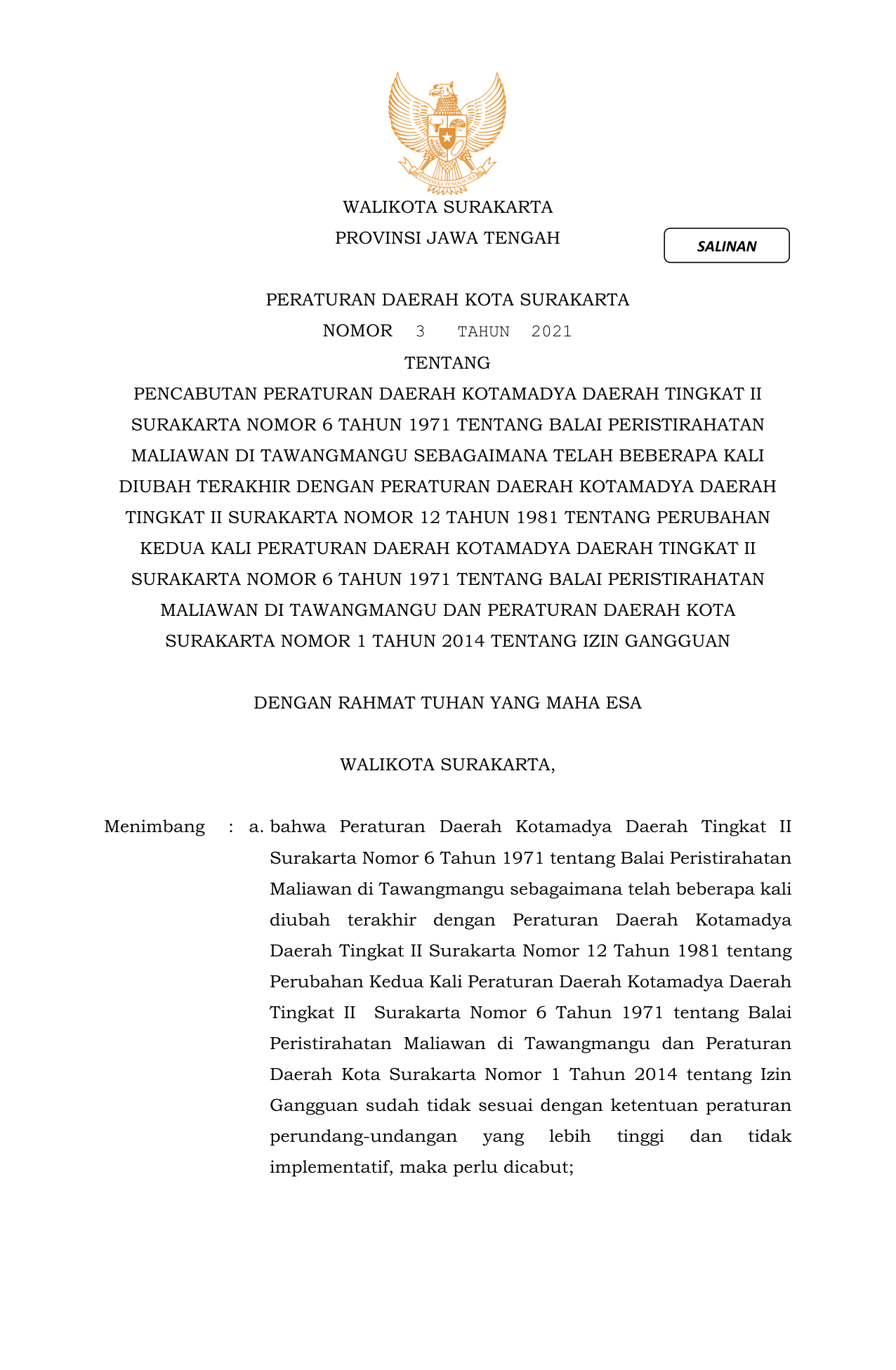 PERDA Nomor 3 Tahun 2021 | Peraturan Daerah Nomor 3 Tahun 2021 tentang PENCABUTAN PERATURAN DAERAH KOTAMADYA DAERAH TINGKAT IISURAKARTA NOMOR 6 TAHUN 1971 TENTANG BALAI PERISTIRAHATANMALIAWAN DI TAWANGMANGU SEBAGAIMANA TELAH BEBERAPA KALIDIUBAH TERAKHIR DENGAN PERATURAN DAERAH KOTAMADYA DAERAHTINGKAT II SURAKARTA NOMOR 12 TAHUN 1981 TENTANG PERUBAHANKEDUA KALI PERATURAN DAERAH KOTAMADYA DAERAH TINGKAT IISURAKARTA NOMOR 6 TAHUN 1971 TENTANG BALAI PERISTIRAHATANMALIAWAN DI TAWANGMANGU DAN PERATURAN DAERAH KOTASURAKARTA NOMOR 1 TAHUN 2014 TENTANG IZIN GANGGUAN