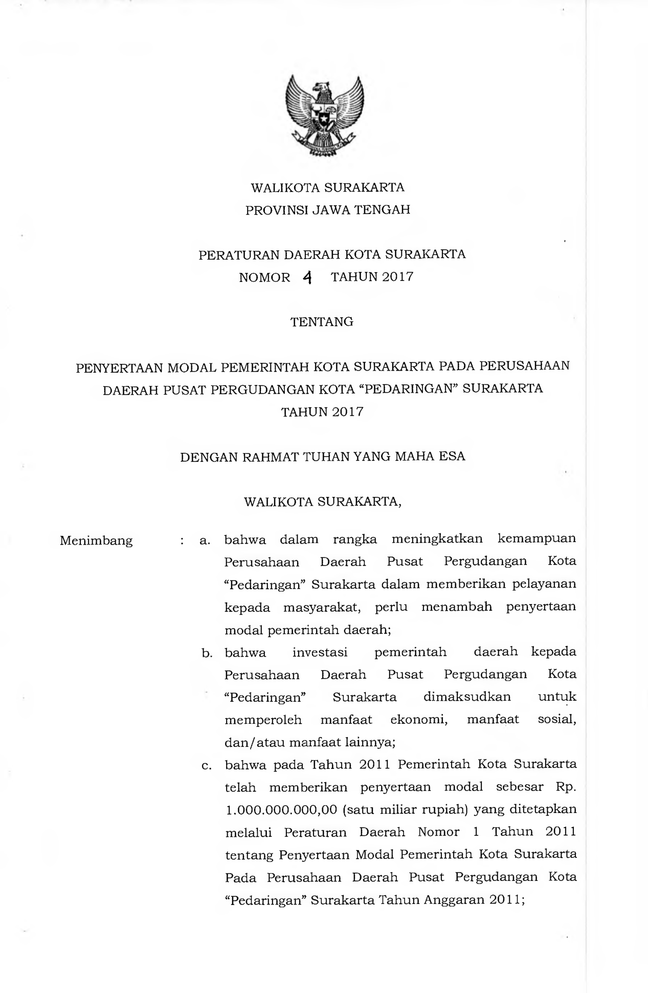 PERDA Nomor 4 Tahun 2017 | Peraturan Daerah Nomor 4 Tahun 2017 tentang PENYERTAAN MODAL PEMERINTAH KOTA SURAKARTA PADA PERUSAHAANDAERAH PUSAT PERGUDANGAN KOTA "PEDARINGAN" SURAKARTATAHUN 2017