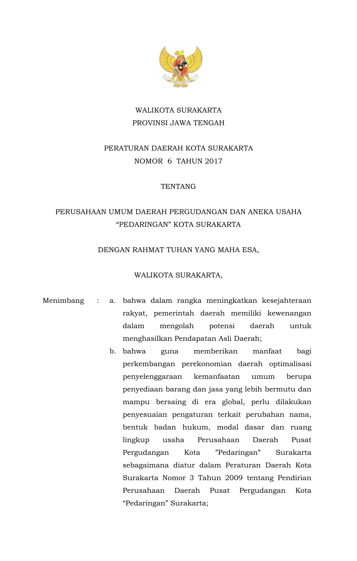 PERDA Nomor 6 Tahun 2017 | Peraturan Daerah Nomor 6 Tahun 2017 tentang PERUSAHAAN UMUM DAERAH PERGUDANGAN DAN ANEKA USAHA“PEDARINGAN” KOTA SURAKARTA