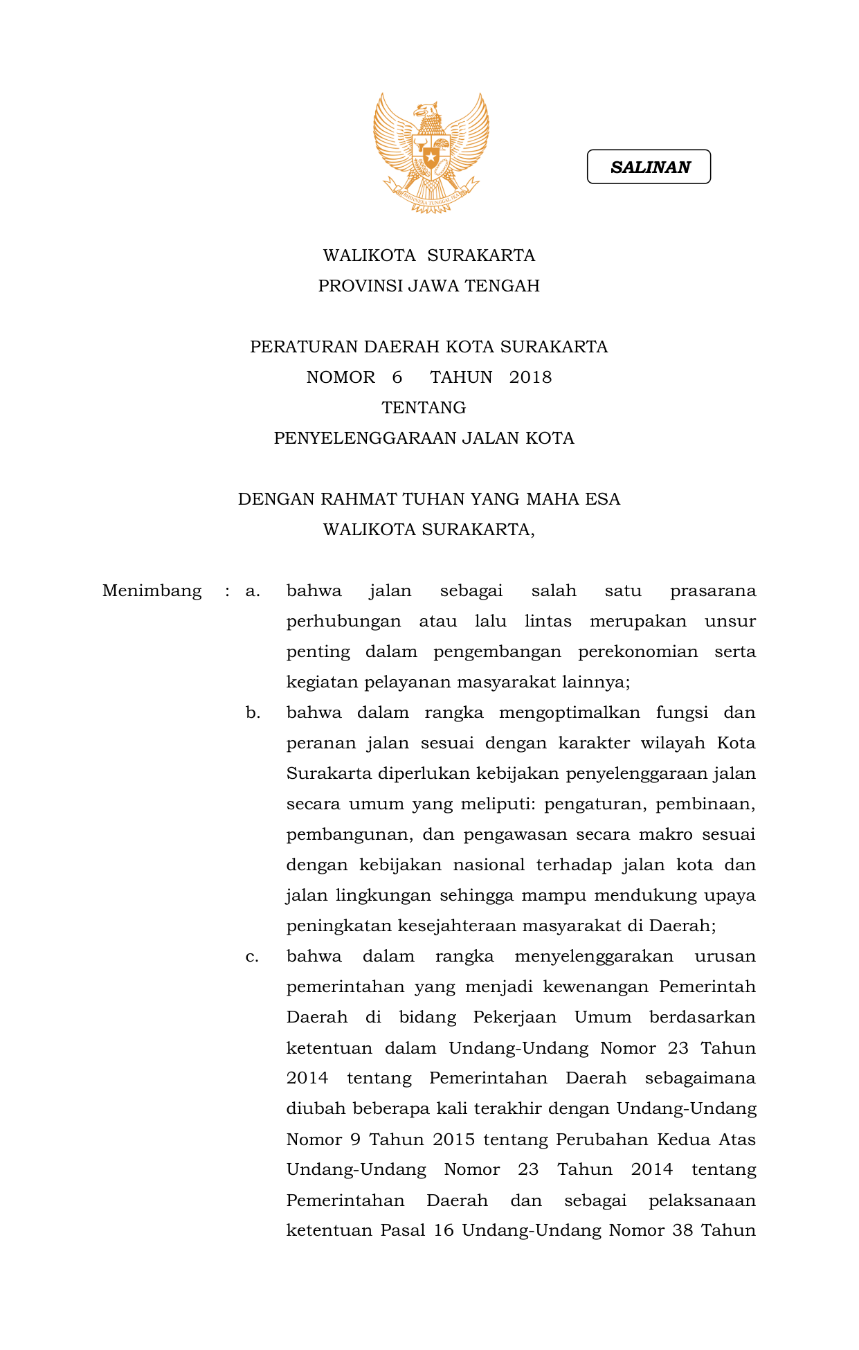 PERDA Nomor 6 Tahun 2018 | Peraturan Daerah Nomor 6 Tahun 2018 tentang PENYELENGGARAAN JALAN KOTA
