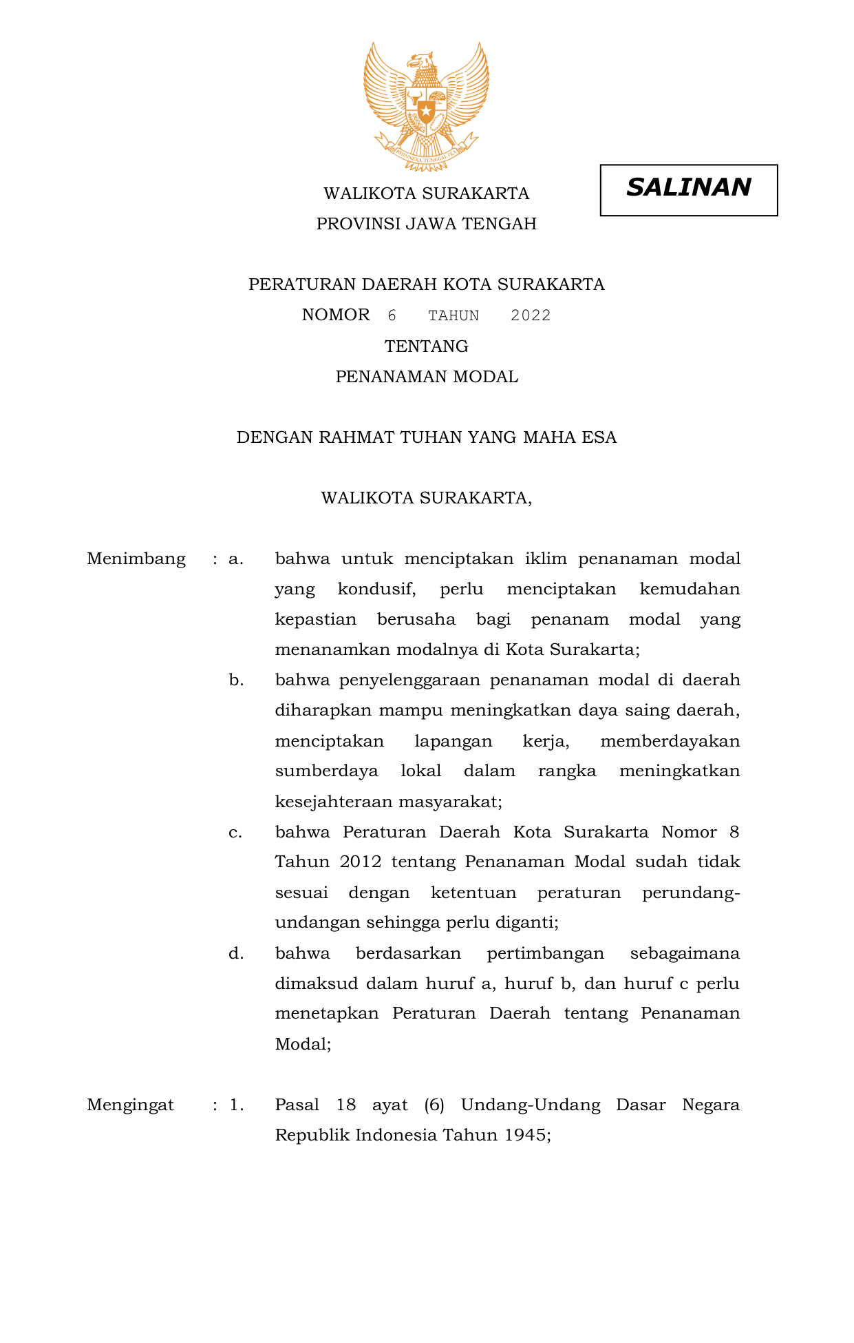 PERDA Nomor 6 Tahun 2022 | Peraturan Daerah Nomor 6 Tahun 2022 tentang PENANAMAN MODAL