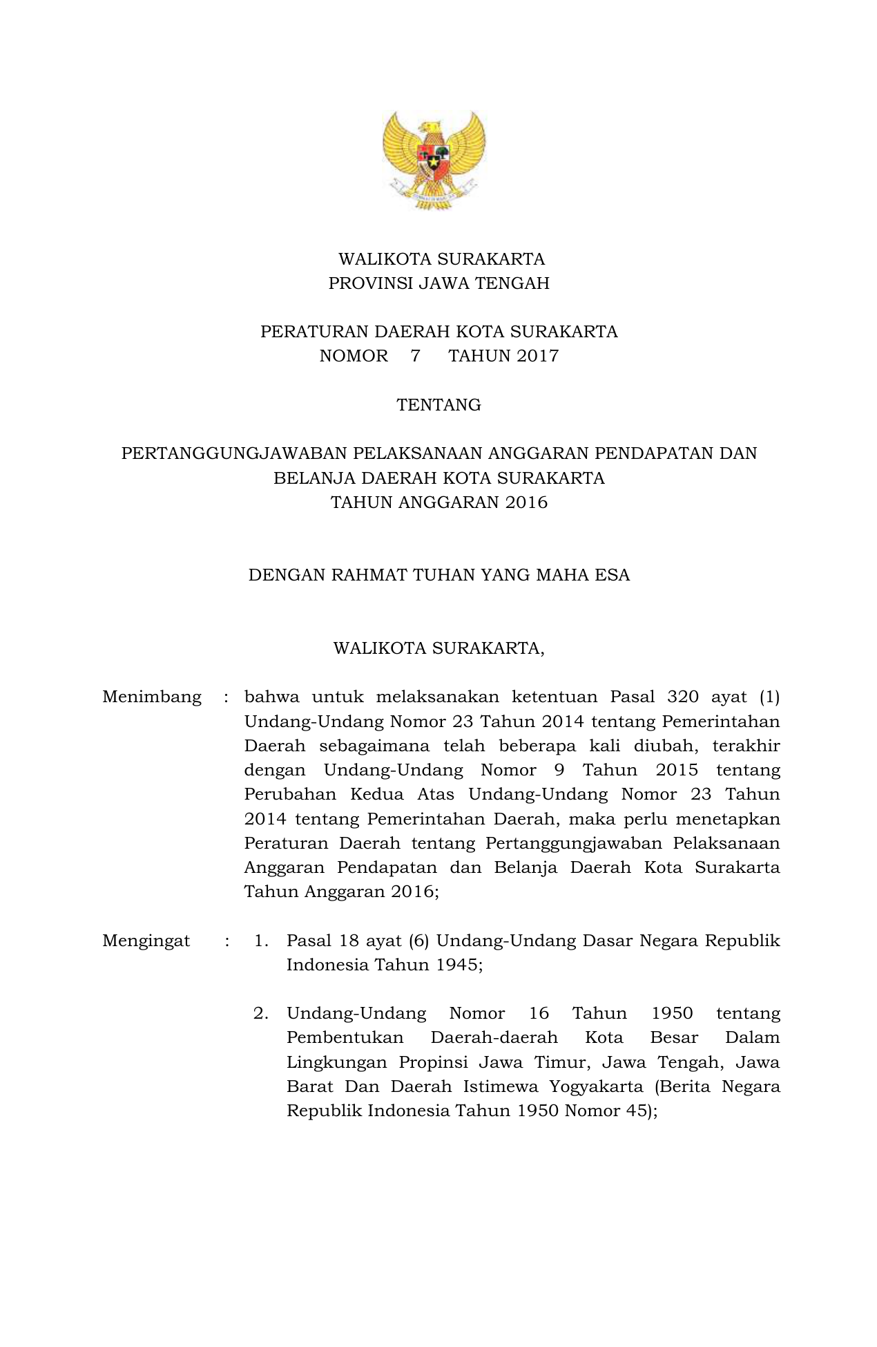 PERDA Nomor 7 Tahun 2017 | Peraturan Daerah Nomor 7 Tahun 2017 tentang PERTANGGUNGJAWABAN PELAKSANAAN ANGGARAN PENDAPATAN DANBELANJA DAERAH KOTA SURAKARTATAHUN ANGGARAN 2016