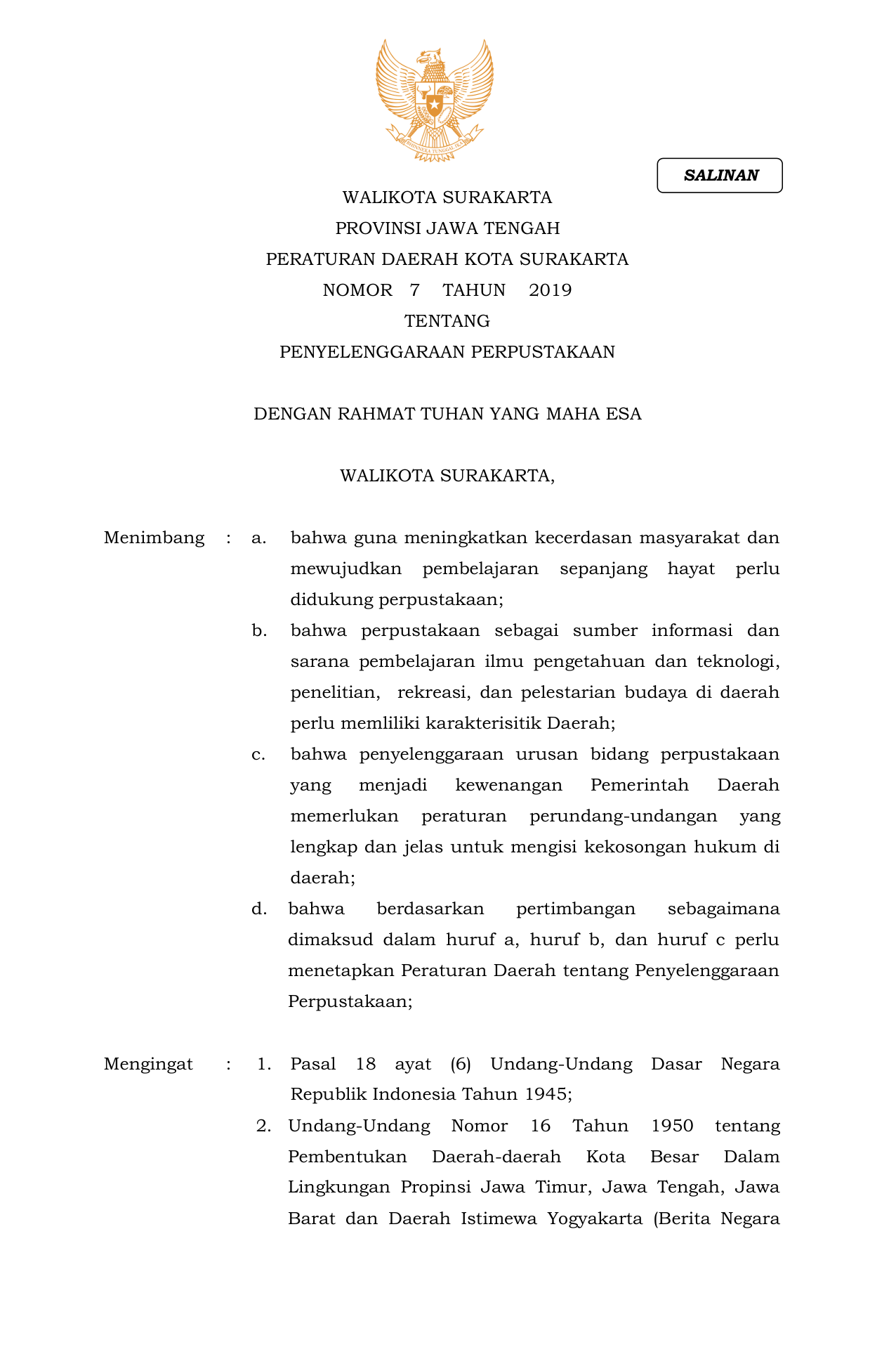 PERDA Nomor 7 Tahun 2019 | Peraturan Daerah Nomor 7 Tahun 2019 tentang PENYELENGGARAAN PERPUSTAKAAN