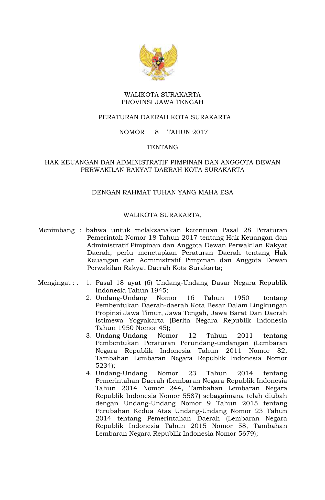 PERDA Nomor 8 Tahun 2017 | Peraturan Daerah Nomor 8 Tahun 2017 tentang HAK KEUANGAN DAN ADMINISTRATIF PIMPINAN DAN ANGGOTA DEWANPERWAKILAN RAKYAT DAERAH KOTA SURAKARTA