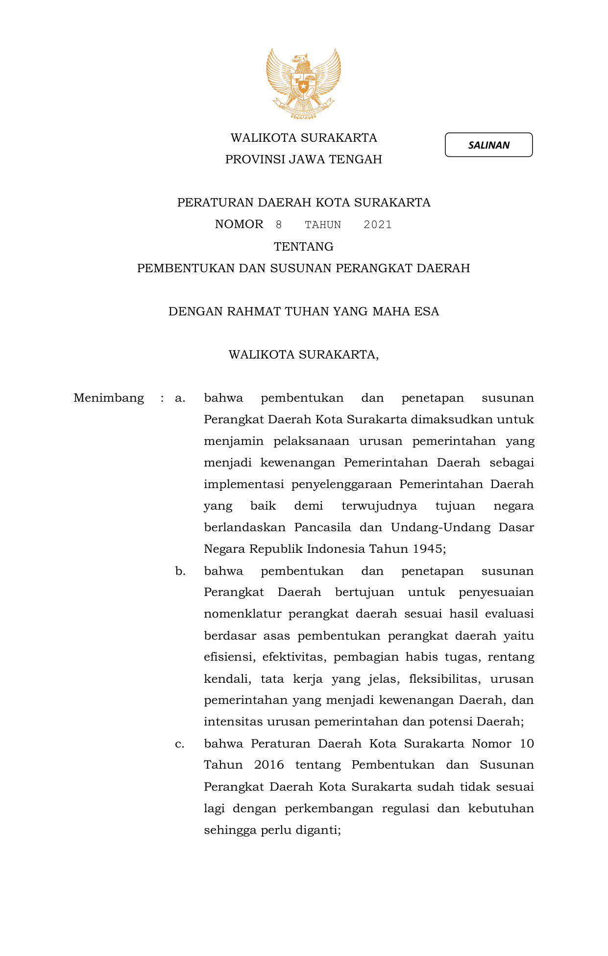 PERDA Nomor 8 Tahun 2021 | Peraturan Daerah Nomor 8 Tahun 2021 tentang PEMBENTUKAN DAN SUSUNAN PERANGKAT DAERAH