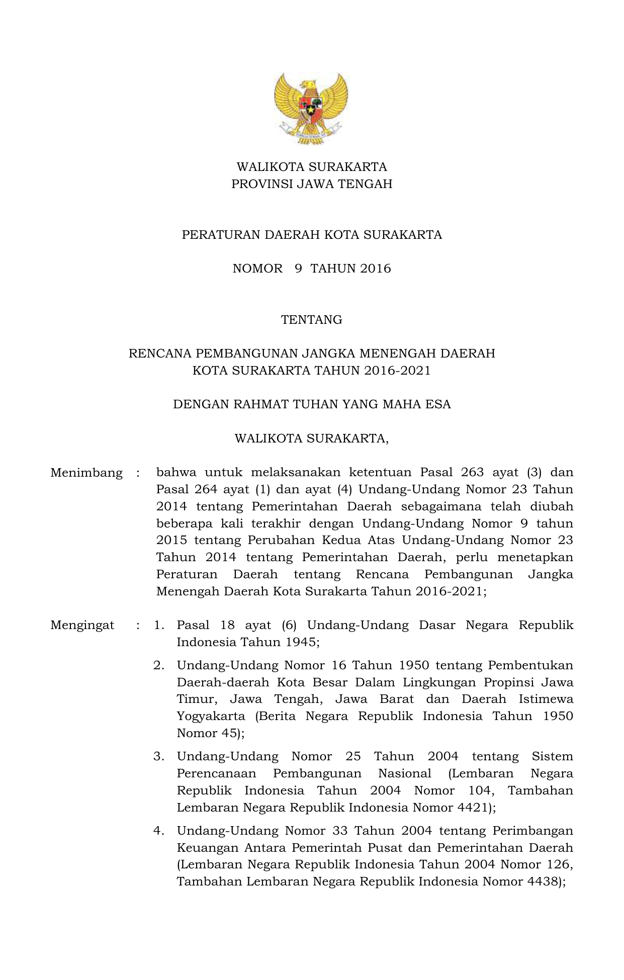 PERDA Nomor 9 Tahun 2016 | Peraturan Daerah Nomor 9 Tahun 2016 tentang RENCANA PEMBANGUNAN JANGKA MENENGAH DAERAH