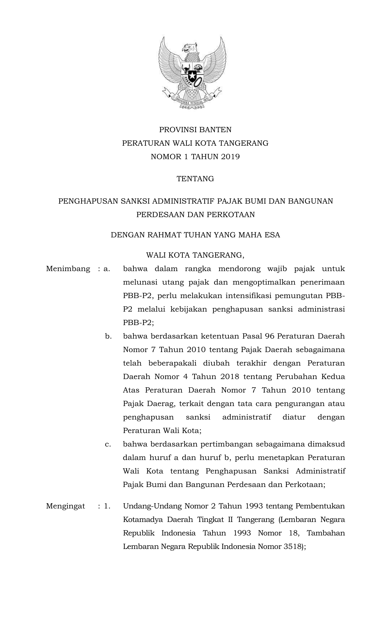PERDA Nomor 1 Tahun 2019 | Peraturan Daerah Nomor 1 Tahun 2019 tentang PENGHAPUSAN SANKSI ADMINISTRATIF PAJAK BUMI DAN BANGUNAN PERDESAAN DAN PERKOTAAN