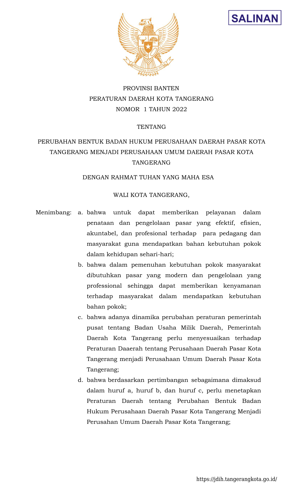 PERDA Nomor 1 Tahun 2022 | Peraturan Daerah Nomor 1 Tahun 2022 tentang PERUBAHAN BENTUK BADAN HUKUM PERUSAHAAN DAERAH PASAR KOTA TANGERANG MENJADI PERUSAHAAN UMUM DAERAH PASAR KOTA TANGERANG