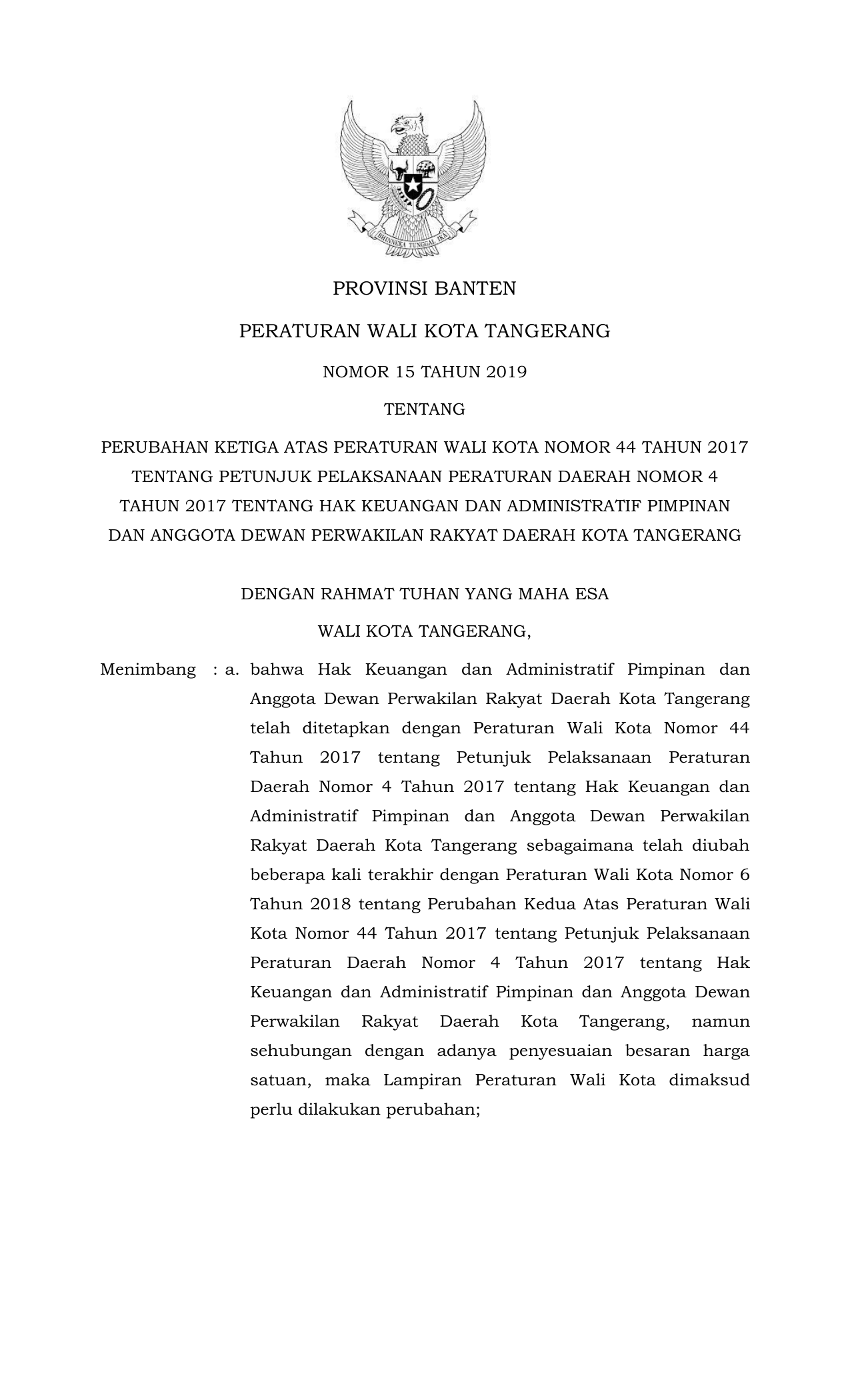 PERDA Nomor 15 Tahun 2019 | Peraturan Daerah Nomor 15 Tahun 2019 tentang PERUBAHAN KETIGA ATAS PERATURAN WALI KOTA NOMOR 44 TAHUN 2017 TENTANG PETUNJUK PELAKSANAAN PERATURAN DAERAH NOMOR 4 TAHUN 2017 TENTANG HAK KEUANGAN DAN ADMINISTRATIF PIMPINAN DAN ANGGOTA DEWAN PERWAKILAN RAKYAT DAERAH KOTA TANGERANG