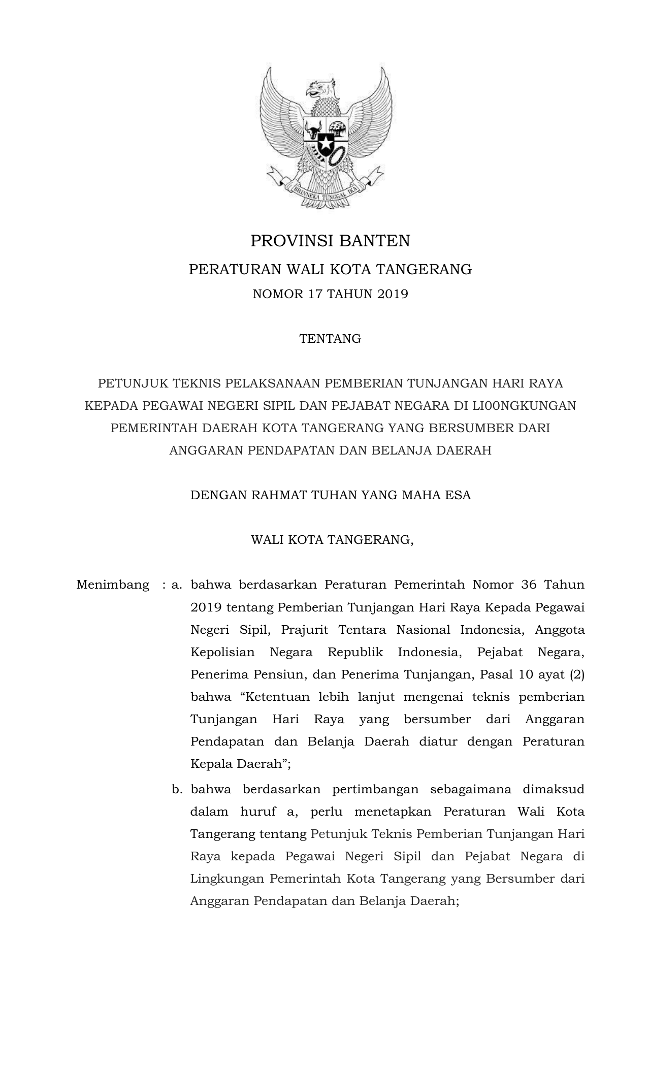 PERDA Nomor 17 Tahun 2019 | Peraturan Daerah Nomor 17 Tahun 2019 tentang PETUNJUK TEKNIS PELAKSANAAN PEMBERIAN TUNJANGAN HARI RAYA KEPADA PEGAWAI NEGERI SIPIL DAN PEJABAT NEGARA DI LI00NGKUNGAN PEMERINTAH DAERAH KOTA TANGERANG YANG BERSUMBER DARI ANGGARAN PENDAPATAN DAN BELANJA DAERAH