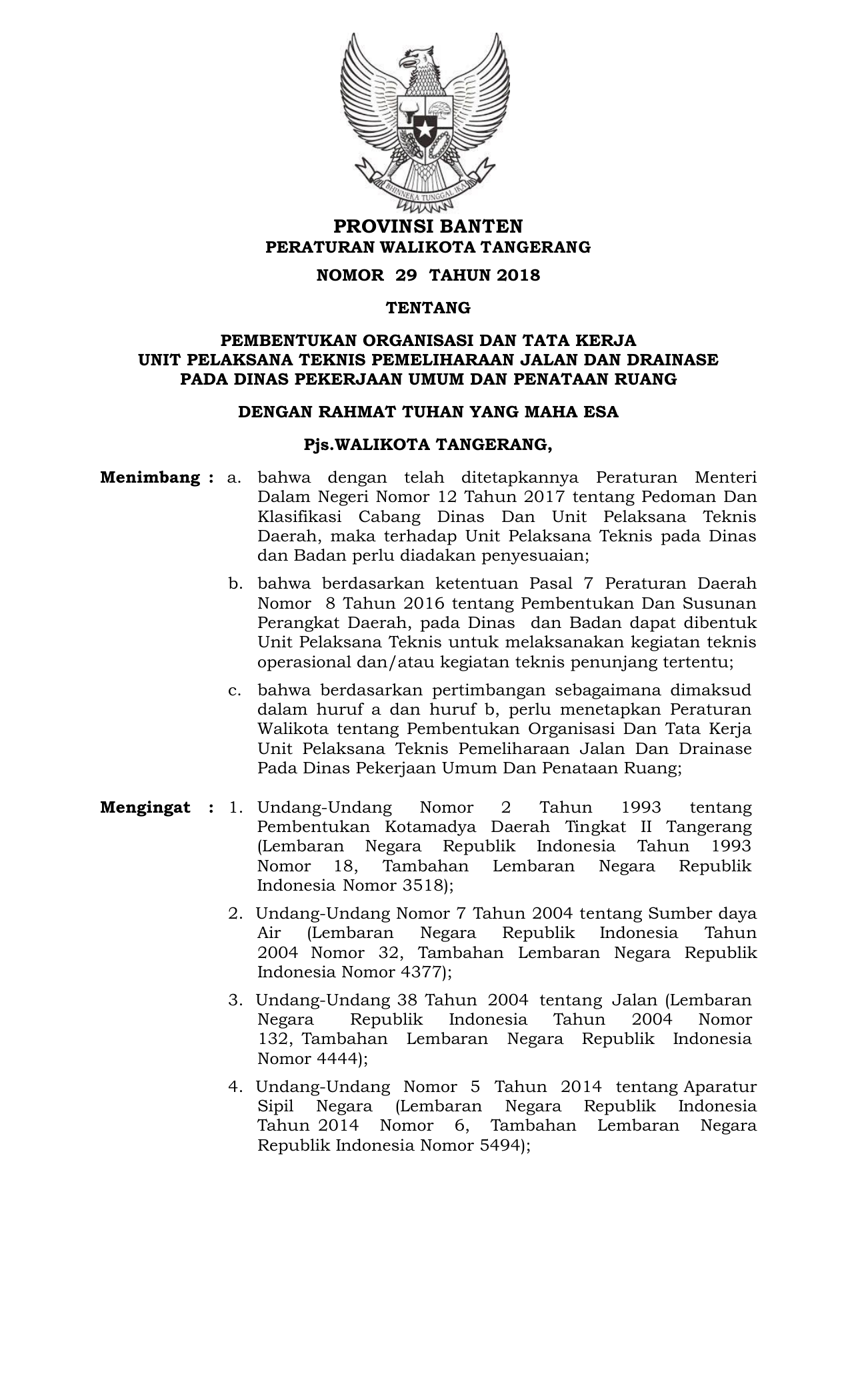 PERDA Nomor 29 Tahun 2018 | Peraturan Daerah Nomor 29 Tahun 2018 tentang PEMBENTUKAN ORGANISASI DAN TATA KERJA UNIT PELAKSANA TEKNIS PEMELIHARAAN JALAN DAN DRAINASE PADA DINAS PEKERJAAN UMUM DAN PENATAAN RUANG