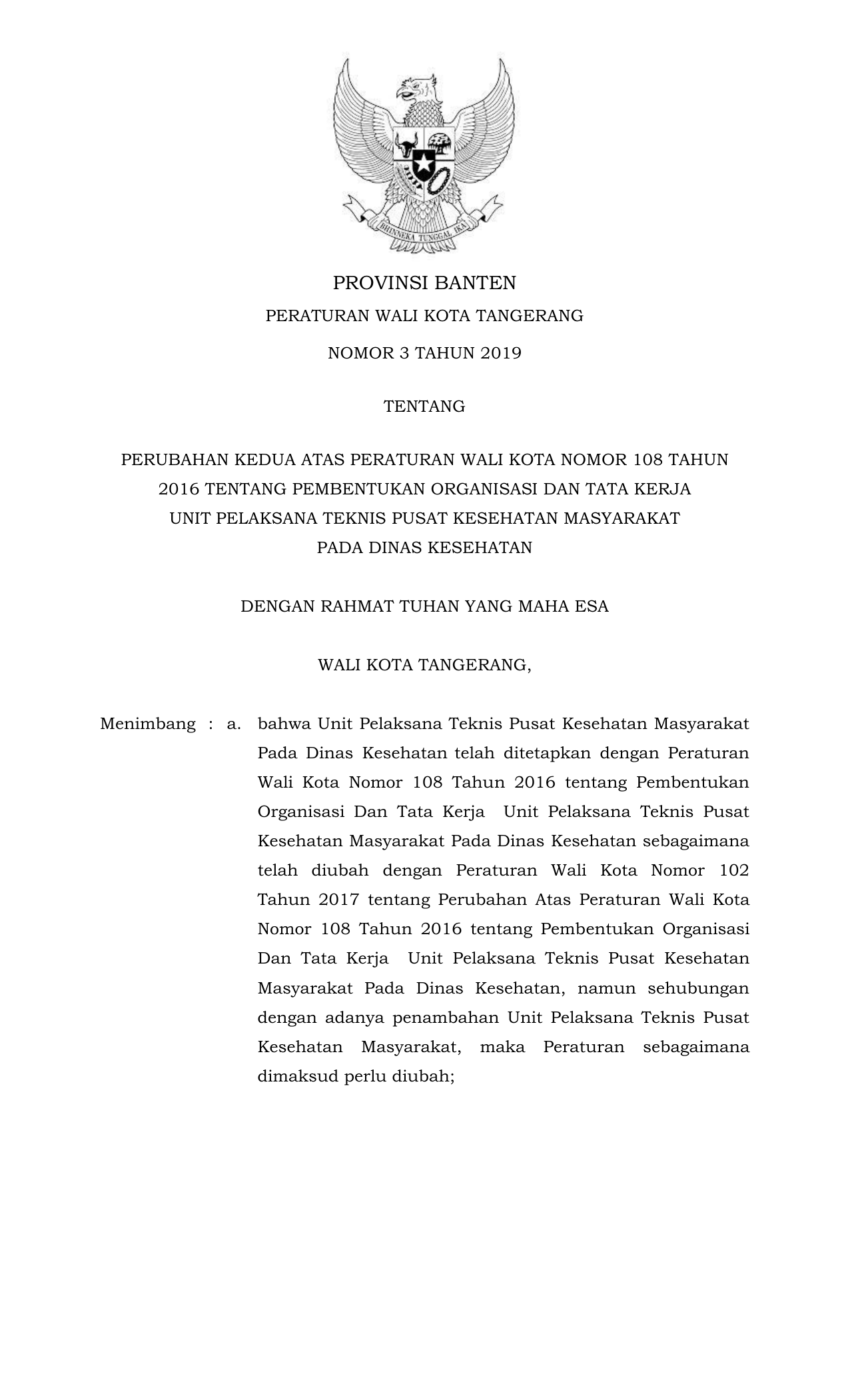 PERDA Nomor 3 Tahun 2019 | Peraturan Daerah Nomor 3 Tahun 2019 tentang PERUBAHAN KEDUA ATAS PERATURAN WALI KOTA NOMOR 108 TAHUN 2016 TENTANG PEMBENTUKAN ORGANISASI DAN TATA KERJA UNIT PELAKSANA TEKNIS PUSAT KESEHATAN MASYARAKAT PADA DINAS KESEHATAN