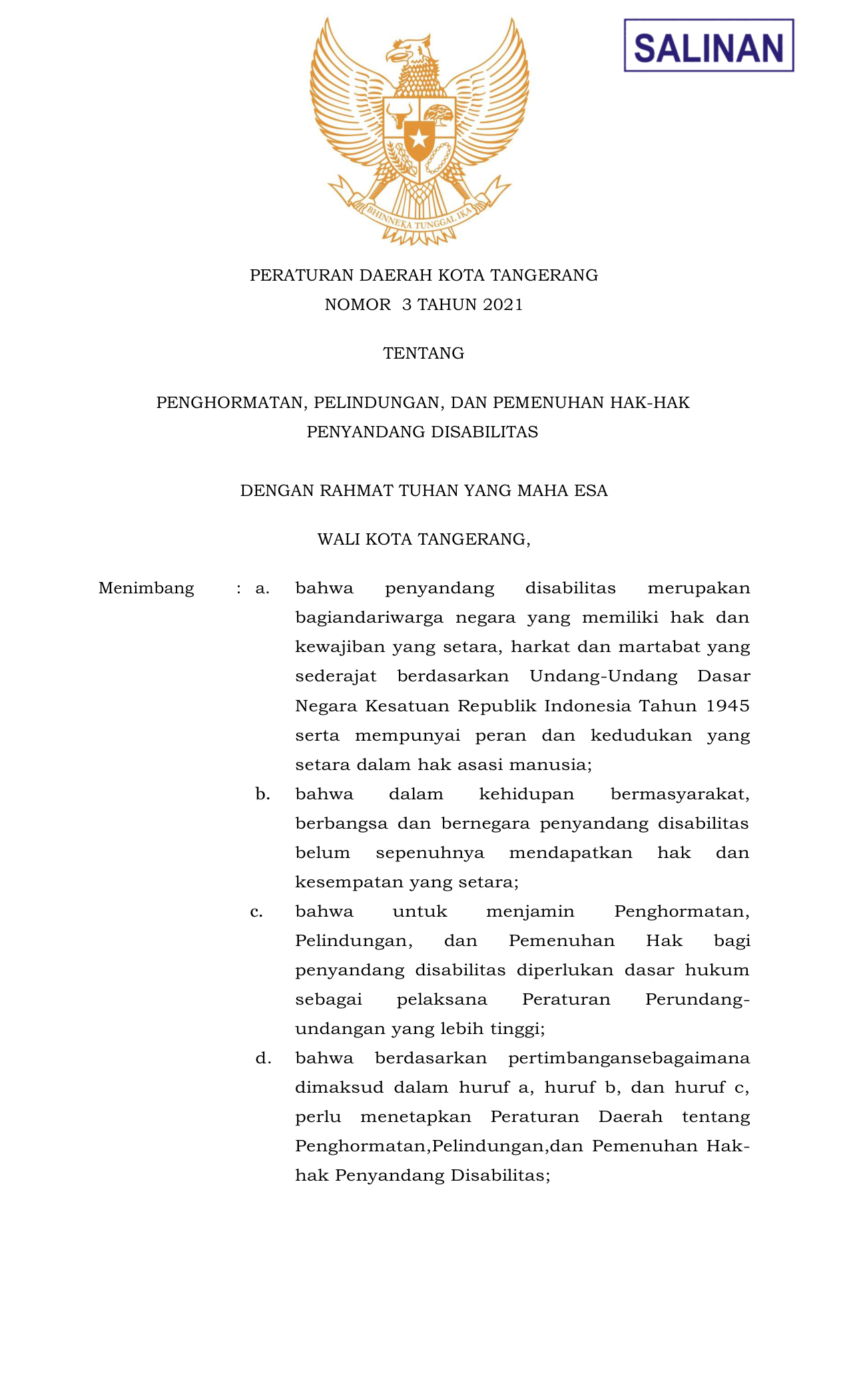 PERDA Nomor 3 Tahun 2021 | Peraturan Daerah Nomor 3 Tahun 2021 tentang PENGHORMATAN, PELINDUNGAN, DAN PEMENUHAN HAK-HAK PENYANDANG DISABILITAS