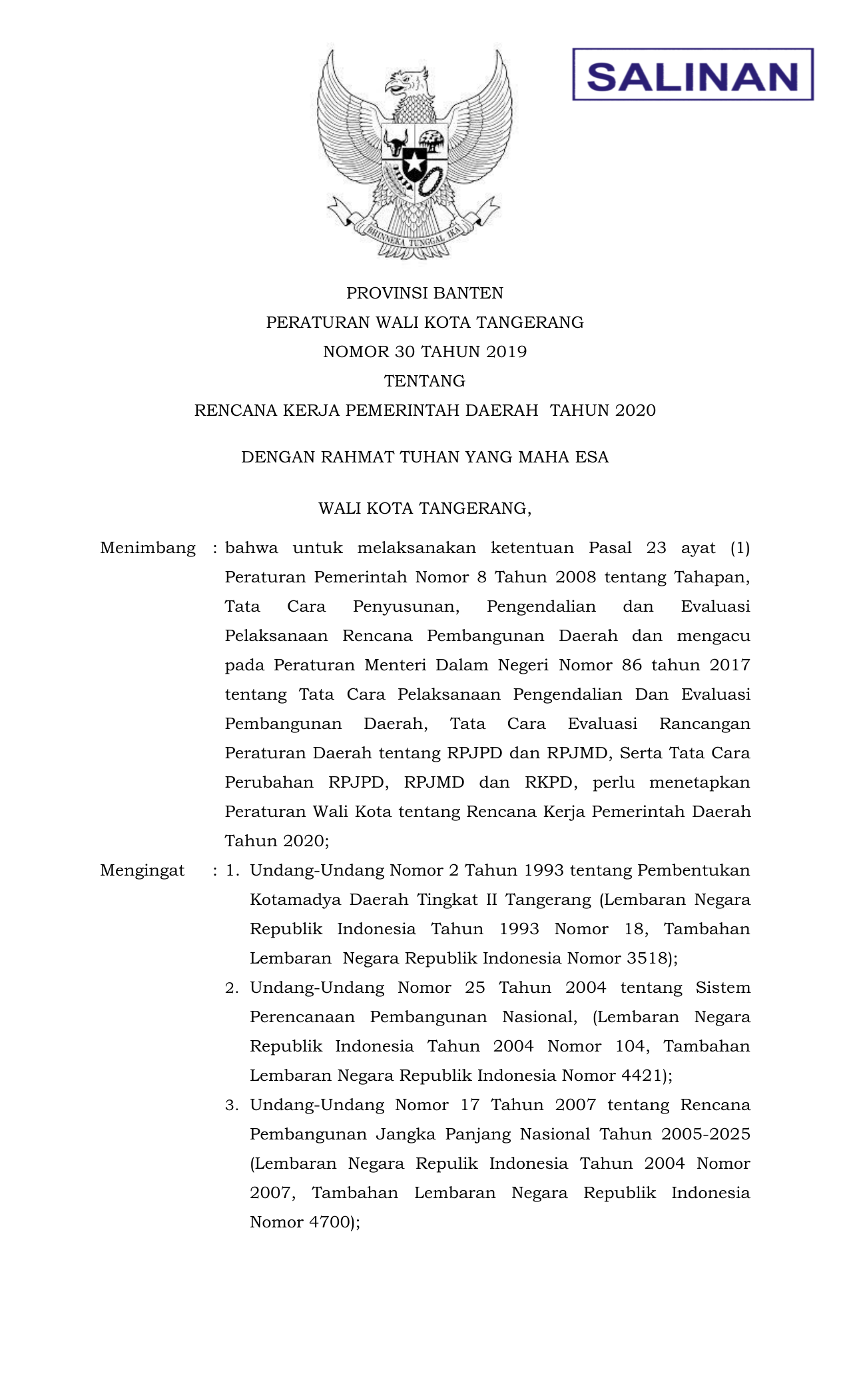 PERDA Nomor 30 Tahun 2019 | Peraturan Daerah Nomor 30 Tahun 2019 tentang RENCANA KERJA PEMERINTAH DAERAH TAHUN 2020