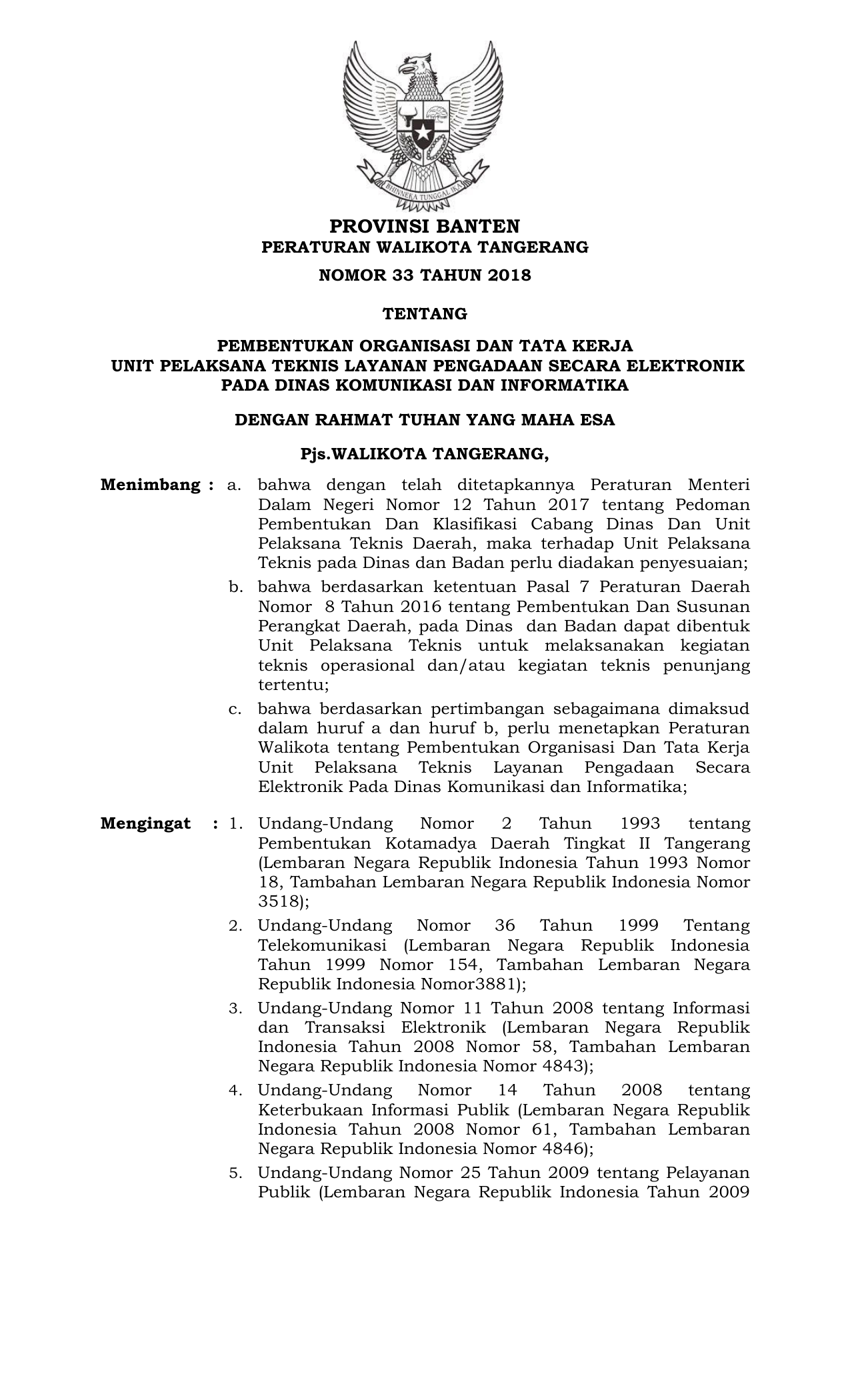 PERDA Nomor 33 Tahun 2018 | Peraturan Daerah Nomor 33 Tahun 2018 tentang PEMBENTUKAN ORGANISASI DAN TATA KERJA UNIT PELAKSANA TEKNIS LAYANAN PENGADAAN SECARA ELEKTRONIK PADA DINAS KOMUNIKASI DAN INFORMATIKA