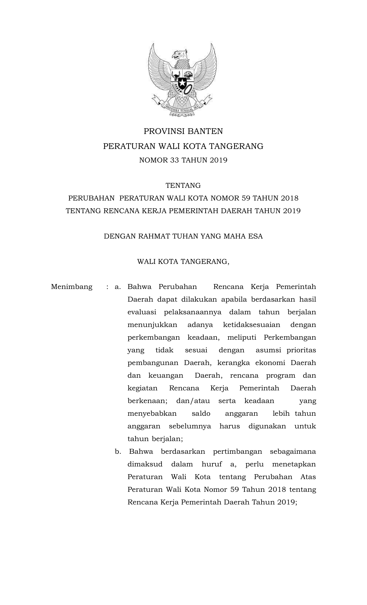 PERDA Nomor 33 Tahun 2019 | Peraturan Daerah Nomor 33 Tahun 2019 tentang PERUBAHAN PERATURAN WALI KOTA NOMOR 59 TAHUN 2018 TENTANG RENCANA KERJA PEMERINTAH DAERAH TAHUN 2019