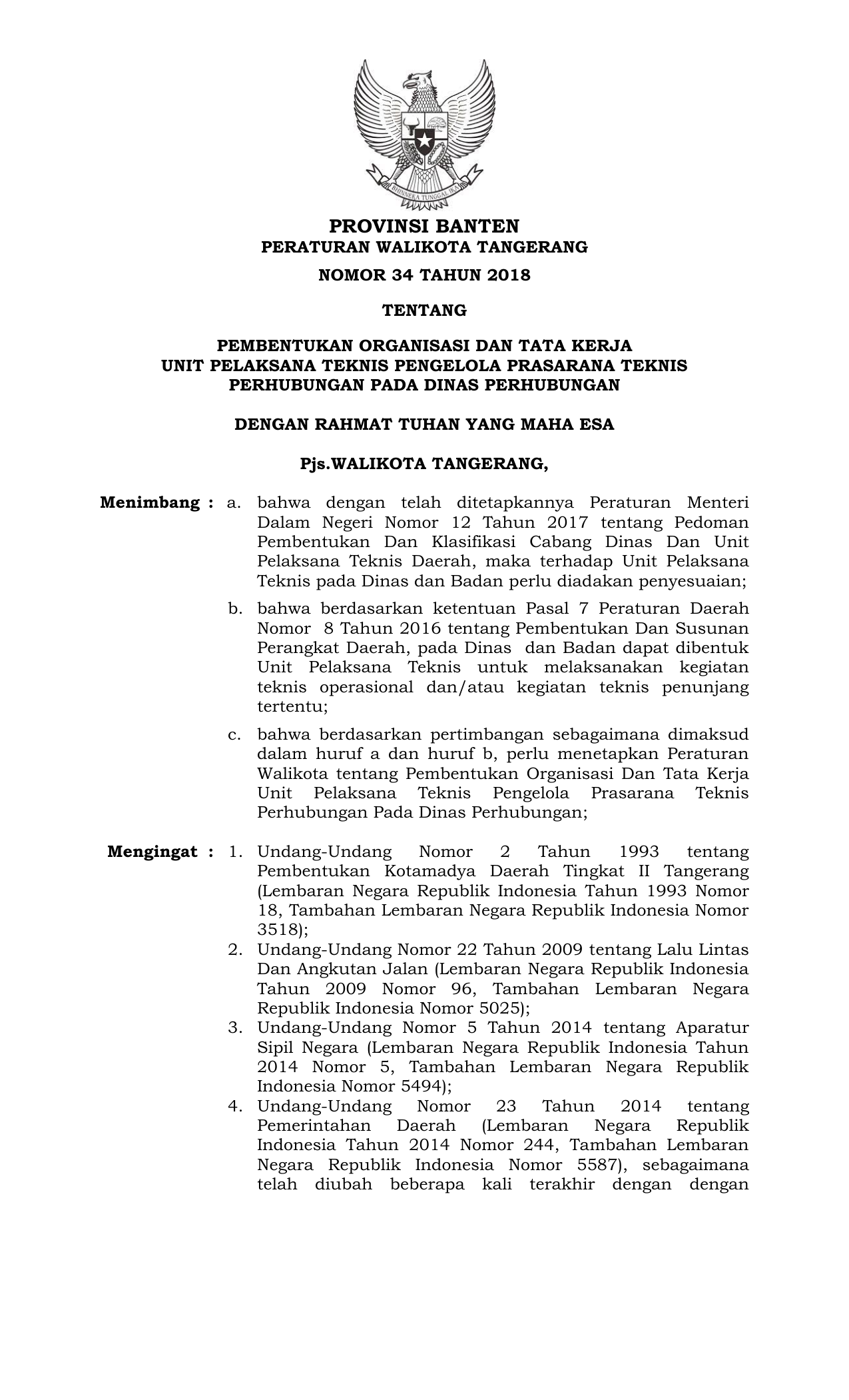 PERDA Nomor 34 Tahun 2018 | Peraturan Daerah Nomor 34 Tahun 2018 tentang PEMBENTUKAN ORGANISASI DAN TATA KERJA UNIT PELAKSANA TEKNIS PENGELOLA PRASARANA TEKNIS PERHUBUNGAN PADA DINAS PERHUBUNGAN