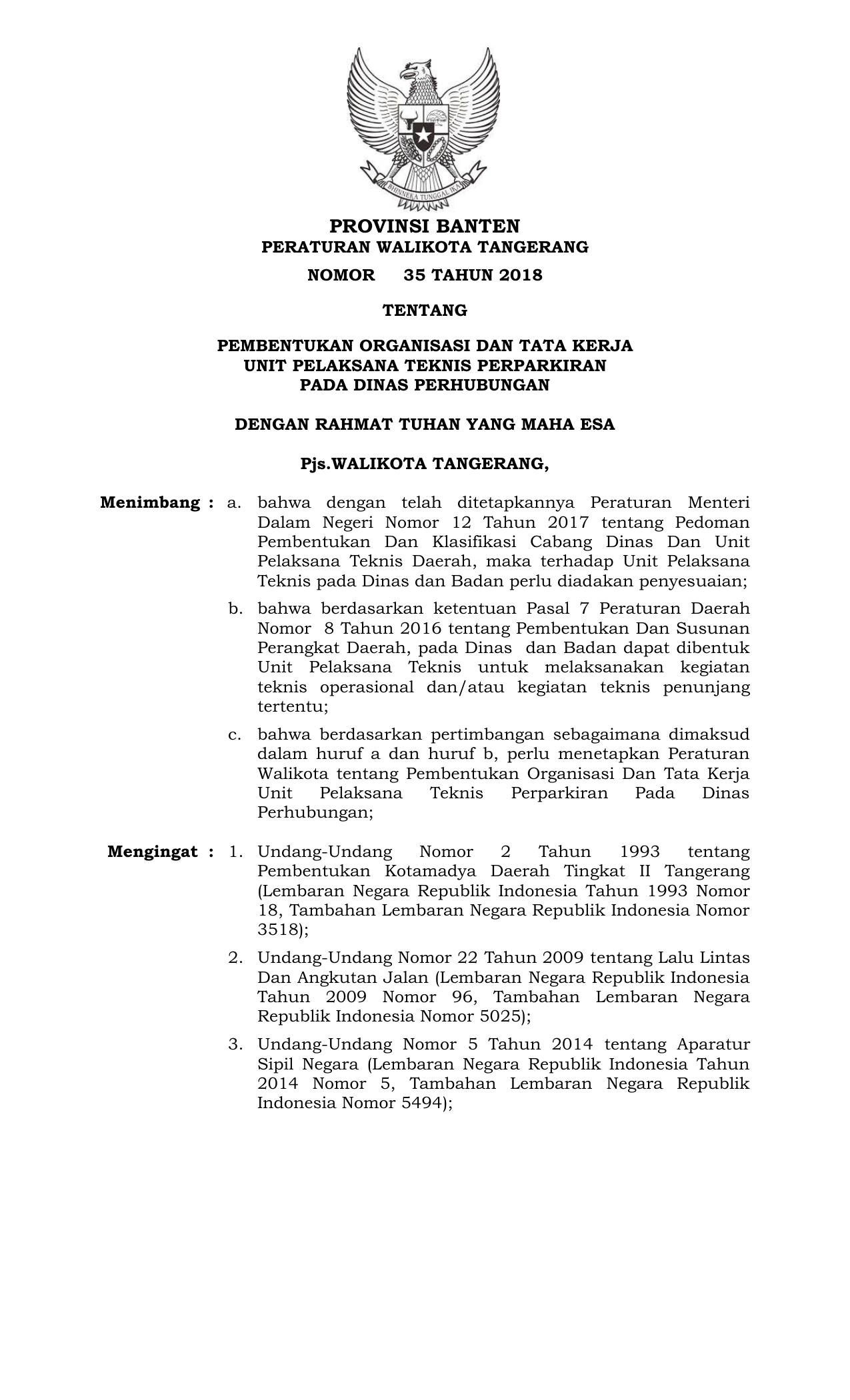 PERDA Nomor 35 Tahun 2018 | Peraturan Daerah Nomor 35 Tahun 2018 tentang PEMBENTUKAN ORGANISASI DAN TATA KERJA UNIT PELAKSANA TEKNIS PERPARKIRAN PADA DINAS PERHUBUNGAN