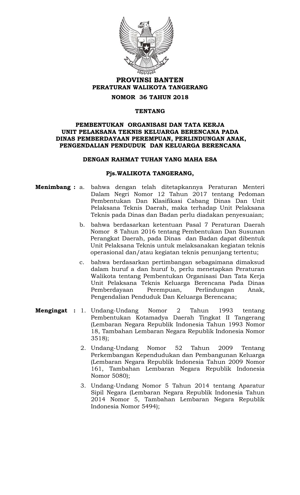 PERDA Nomor 36 Tahun 2018 | Peraturan Daerah Nomor 36 Tahun 2018 tentang PEMBENTUKAN ORGANISASI DAN TATA KERJA UNIT PELAKSANA TEKNIS KELUARGA BERENCANA PADA DINAS PEMBERDAYAAN PEREMPUAN, PERLINDUNGAN ANAK, PENGENDALIAN PENDUDUK DAN KELUARGA BERENCANA