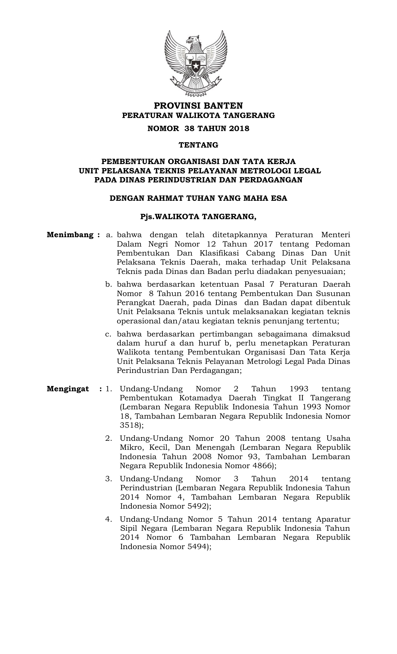 PERDA Nomor 38 Tahun 2018 | Peraturan Daerah Nomor 38 Tahun 2018 tentang PEMBENTUKAN ORGANISASI DAN TATA KERJA UNIT PELAKSANA TEKNIS PELAYANAN METROLOGI LEGAL PADA DINAS PERINDUSTRIAN DAN PERDAGANGAN