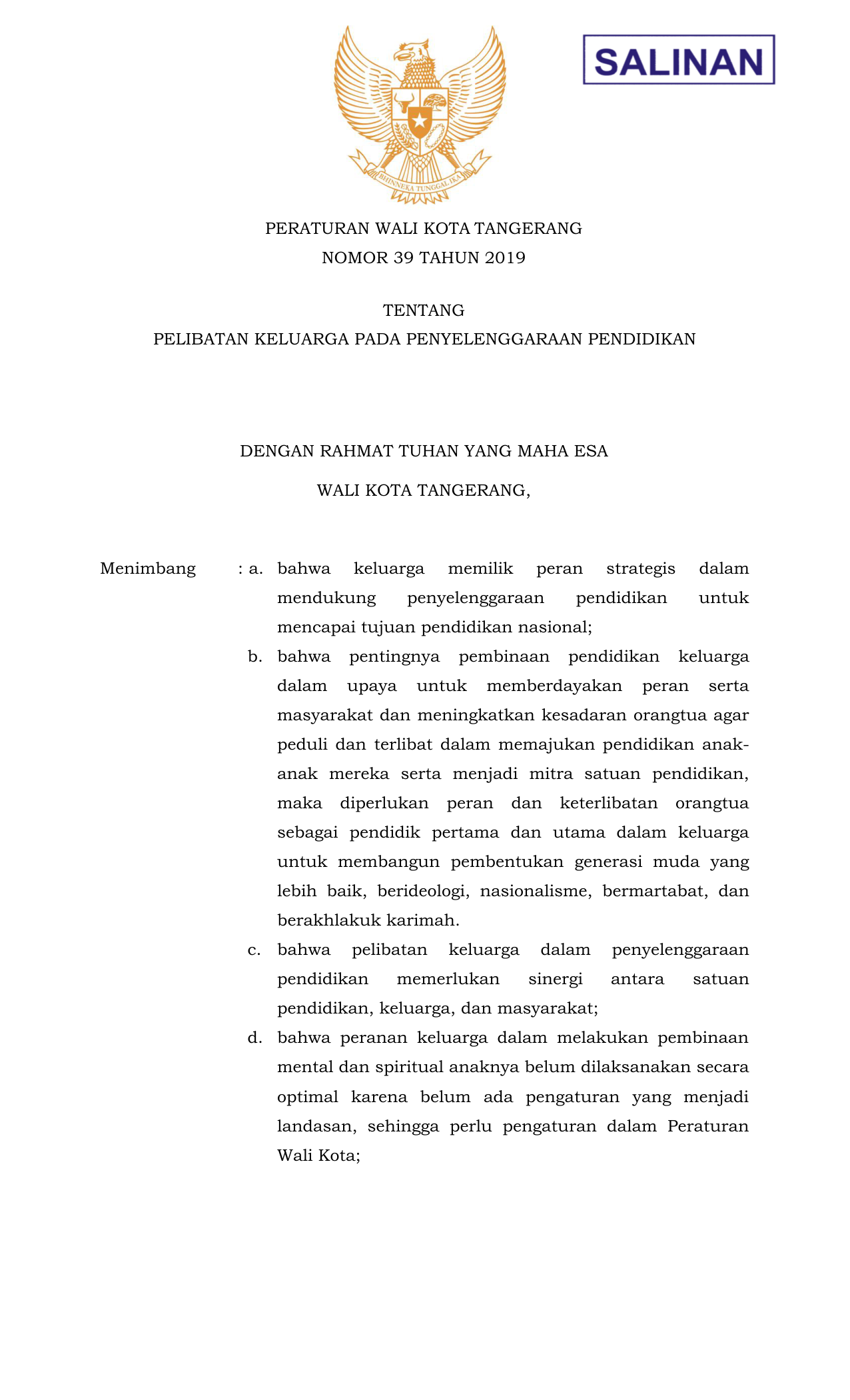 PERDA Nomor 39 Tahun 2019 | Peraturan Daerah Nomor 39 Tahun 2019 tentang PELIBATAN KELUARGA PADA PENYELENGGARAAN PENDIDIKAN