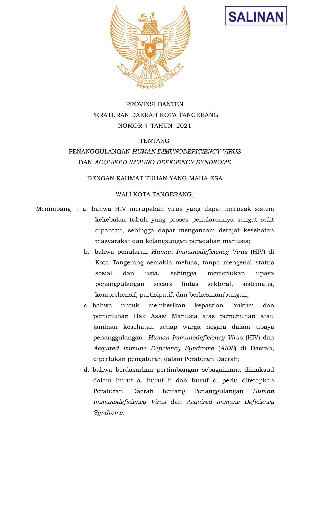 PERDA Nomor 4 Tahun 2021 | Peraturan Daerah Nomor 4 Tahun 2021 tentang PENANGGULANGAN HUMAN IMMUNODEFICIENCY VIRUS DAN ACQUIRED IMMUNO DEFICIENCY SYNDROME
