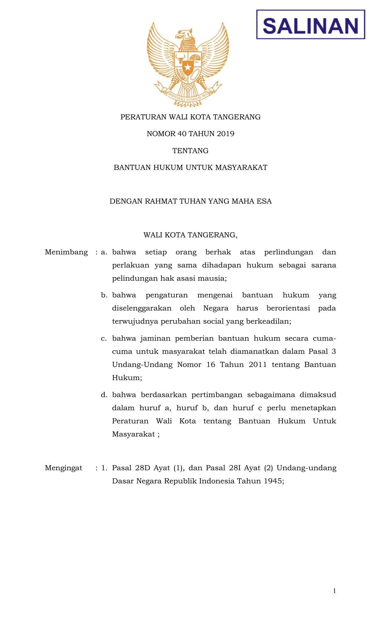 PERDA Nomor 40 Tahun 2019 | Peraturan Daerah Nomor 40 Tahun 2019 tentang BANTUAN HUKUM UNTUK MASYARAKAT