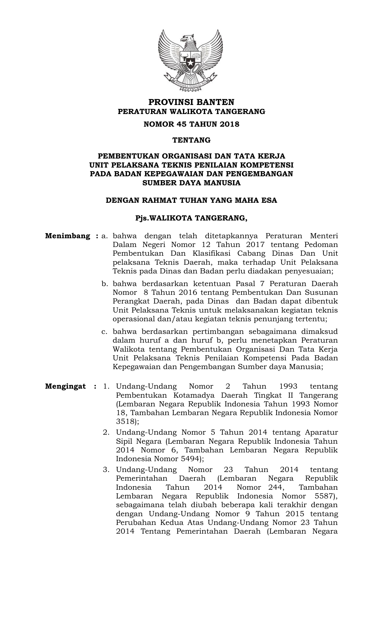 PERDA Nomor 45 Tahun 2018 | Peraturan Daerah Nomor 45 Tahun 2018 tentang PEMBENTUKAN ORGANISASI DAN TATA KERJA UNIT PELAKSANA TEKNIS PENILAIAN KOMPETENSI PADA BADAN KEPEGAWAIAN DAN PENGEMBANGAN SUMBER DAYA MANUSIA