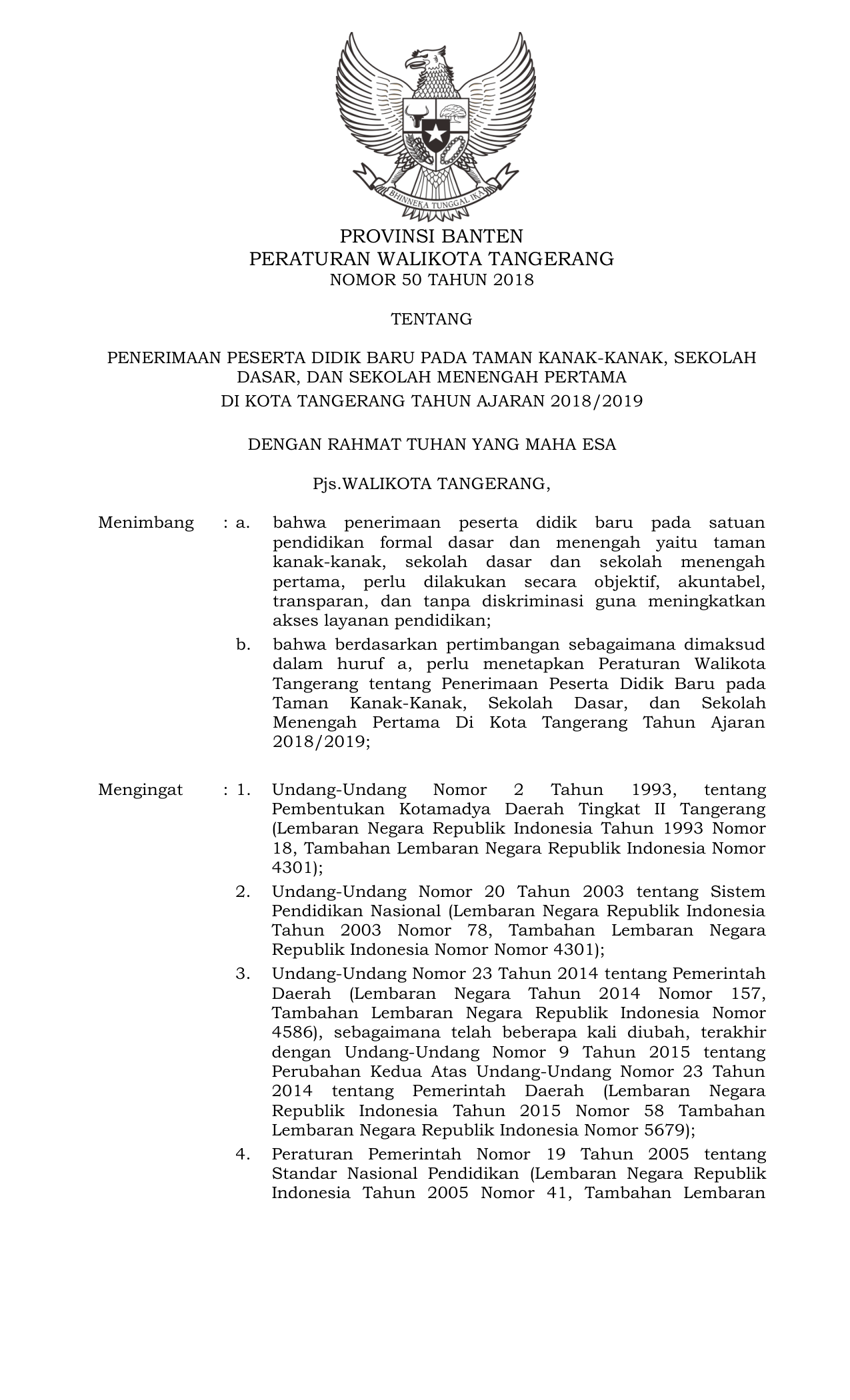 PERDA Nomor 50 Tahun 2018 | Peraturan Daerah Nomor 50 Tahun 2018 tentang PENERIMAAN PESERTA DIDIK BARU PADA TAMAN KANAK-KANAK, SEKOLAH DASAR, DAN SEKOLAH MENENGAH PERTAMA DI KOTA TANGERANG TAHUN AJARAN 2018/2019