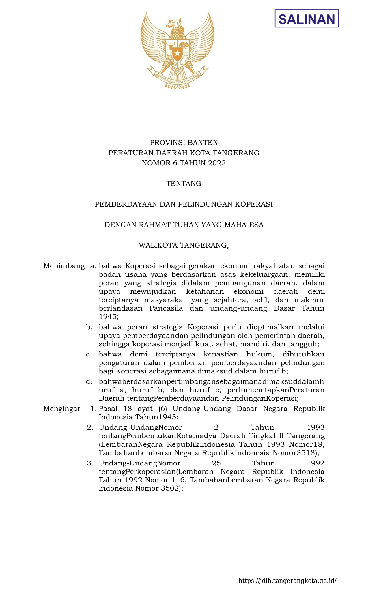 PERDA Nomor 6 Tahun 2022 | Peraturan Daerah Nomor 6 Tahun 2022 tentang PEMBERDAYAAN DAN PELINDUNGAN KOPERASI