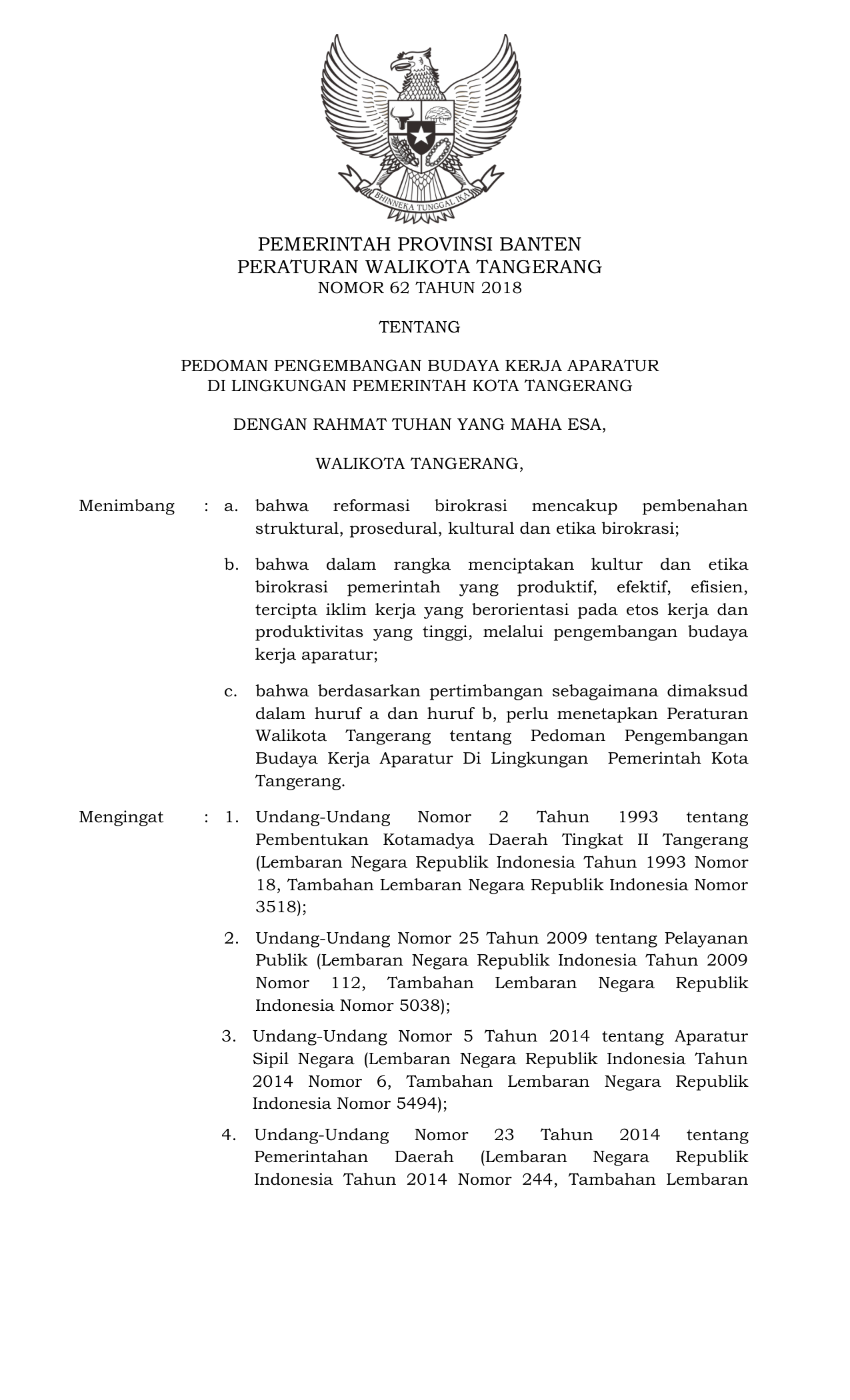 PERDA Nomor 62 Tahun 2018 | Peraturan Daerah Nomor 62 Tahun 2018 tentang PEDOMAN PENGEMBANGAN BUDAYA KERJA APARATUR DI LINGKUNGAN PEMERINTAH KOTA TANGERANG