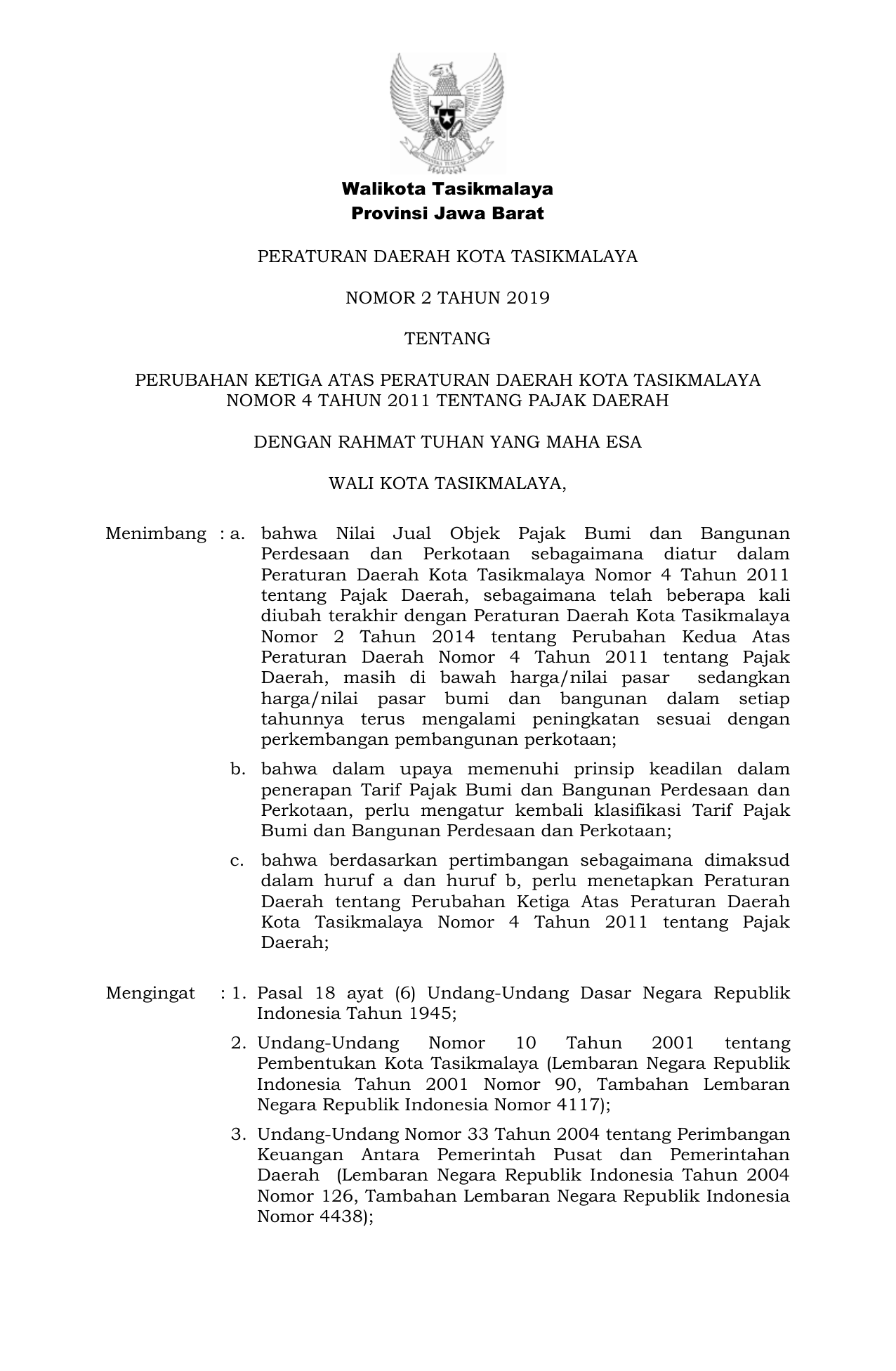 PERDA Nomor 2 Tahun 2019 | Peraturan Daerah Nomor 2 Tahun 2019 tentang PERUBAHAN KETIGA ATAS PERATURAN DAERAH KOTA TASIKMALAYANOMOR 4 TAHUN 2011 TENTANG PAJAK DAERAH