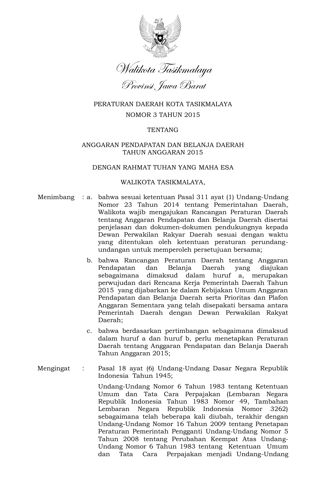 PERDA Nomor 3 Tahun 2015 | Peraturan Daerah Nomor 3 Tahun 2015 tentang ANGGARAN PENDAPATAN DAN BELANJA DAERAH