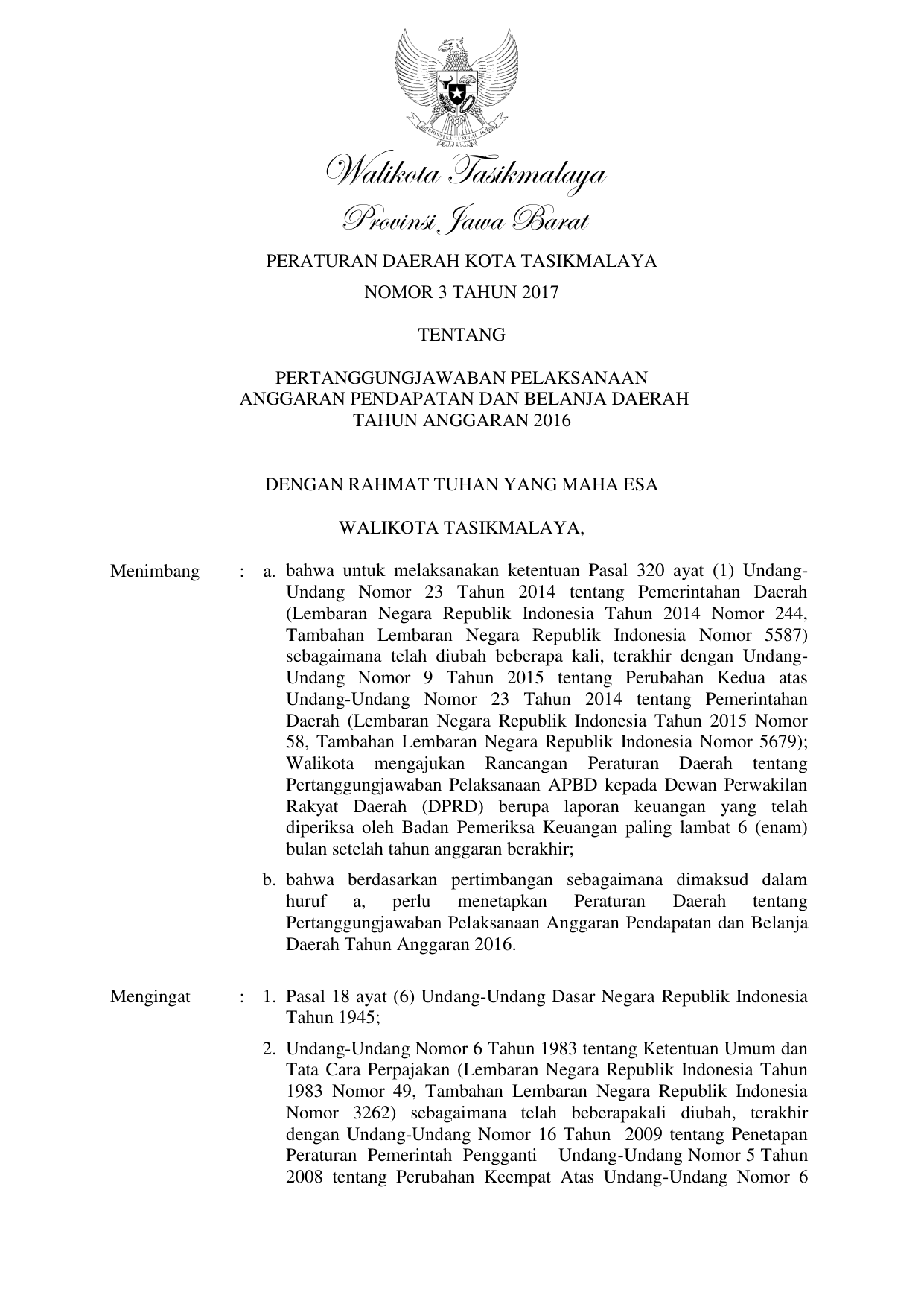 PERDA Nomor 3 Tahun 2017 | Peraturan Daerah Nomor 3 Tahun 2017 tentang PERTANGGUNGJAWABAN PELAKSANAANANGGARAN PENDAPATAN DAN BELANJA DAERAHTAHUN ANGGARAN 2016