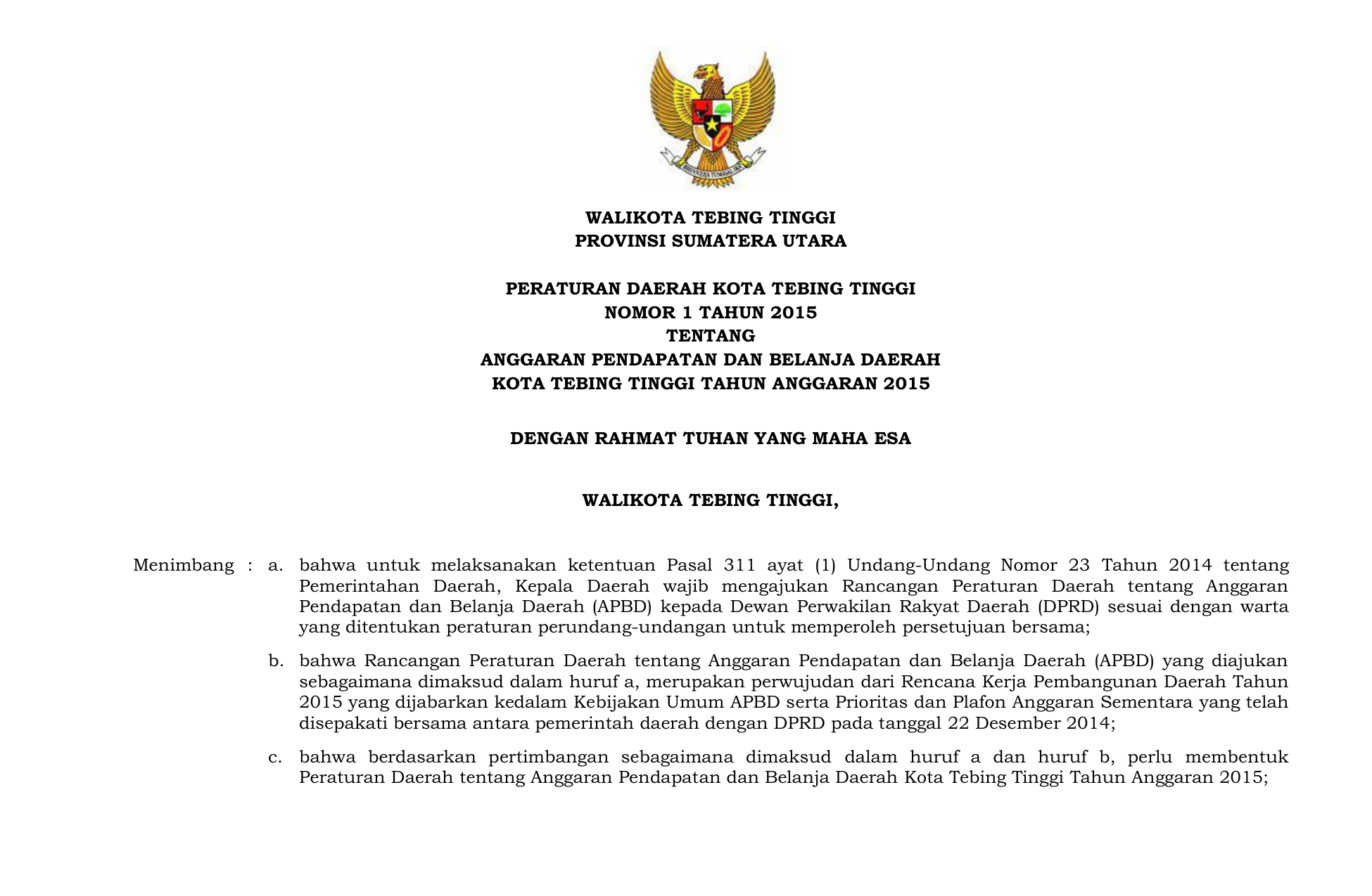 PERDA Nomor 1 Tahun 2015 | Peraturan Daerah Nomor 1 Tahun 2015 tentang Anggaran Pendapatan dan Belanja Daerah Kota Tebing Tinggi Tahun Anggran 2015