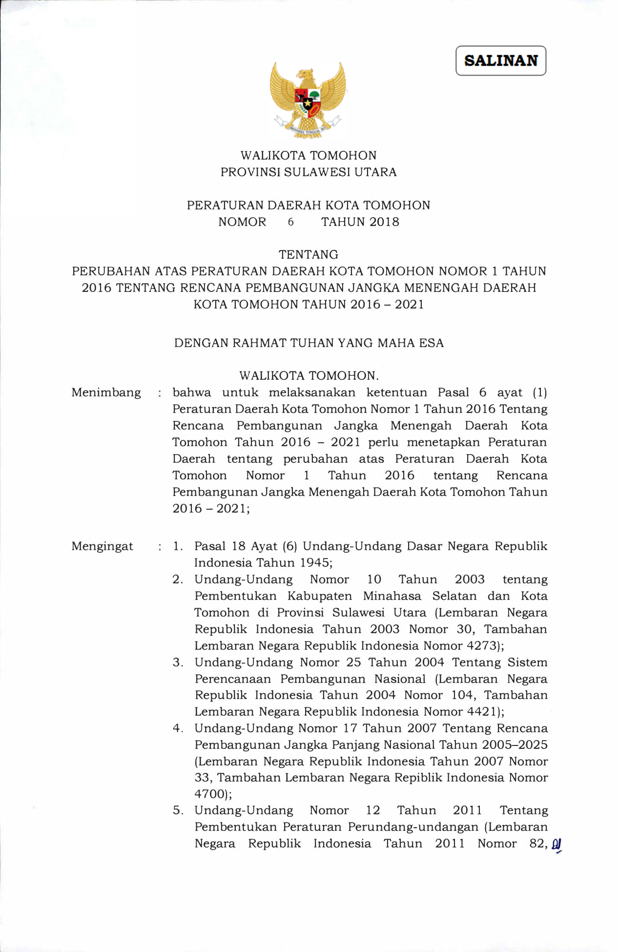 PERDA Nomor 6 Tahun 2018 | Peraturan Daerah Nomor 6 Tahun 2018 tentang PERUBAHAN ATAS PERATURAN DAERAH KOTA TOMOHON NOMOR 1 TAHUN 2016 TENTANG RENCANA PEMBANGUNAN JANGKA MENENGAH DAERAH KOTA TOMOHON TAHUN 2016-2021