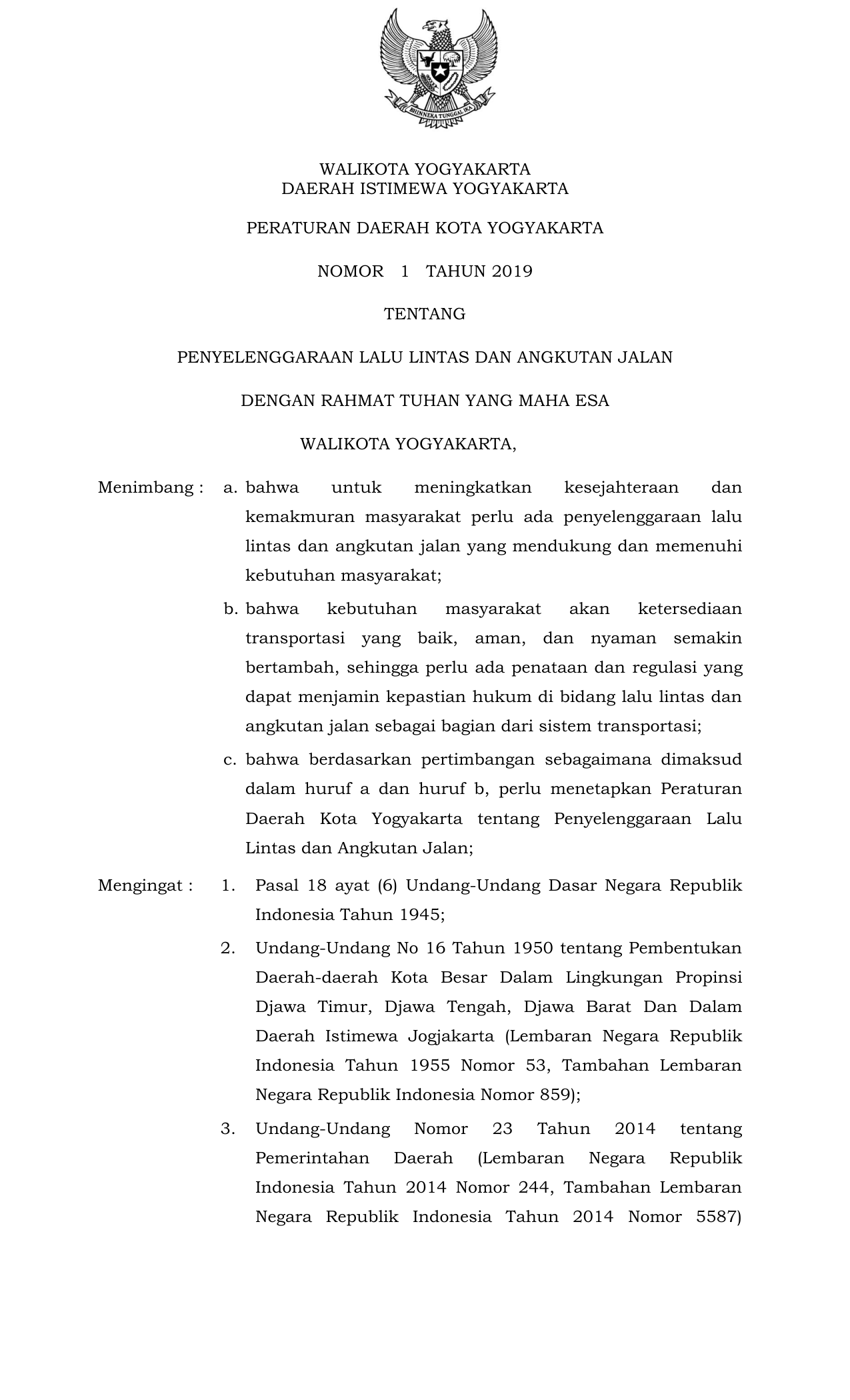 PERDA Nomor 1 Tahun 2019 | Peraturan Daerah Nomor 1 Tahun 2019 tentang Peraturan Daerah Kota Yogyakarta No. 1 Tahun 2019 tentang Penyelenggaraan Lalu Lintas dan Angkutan Jalan