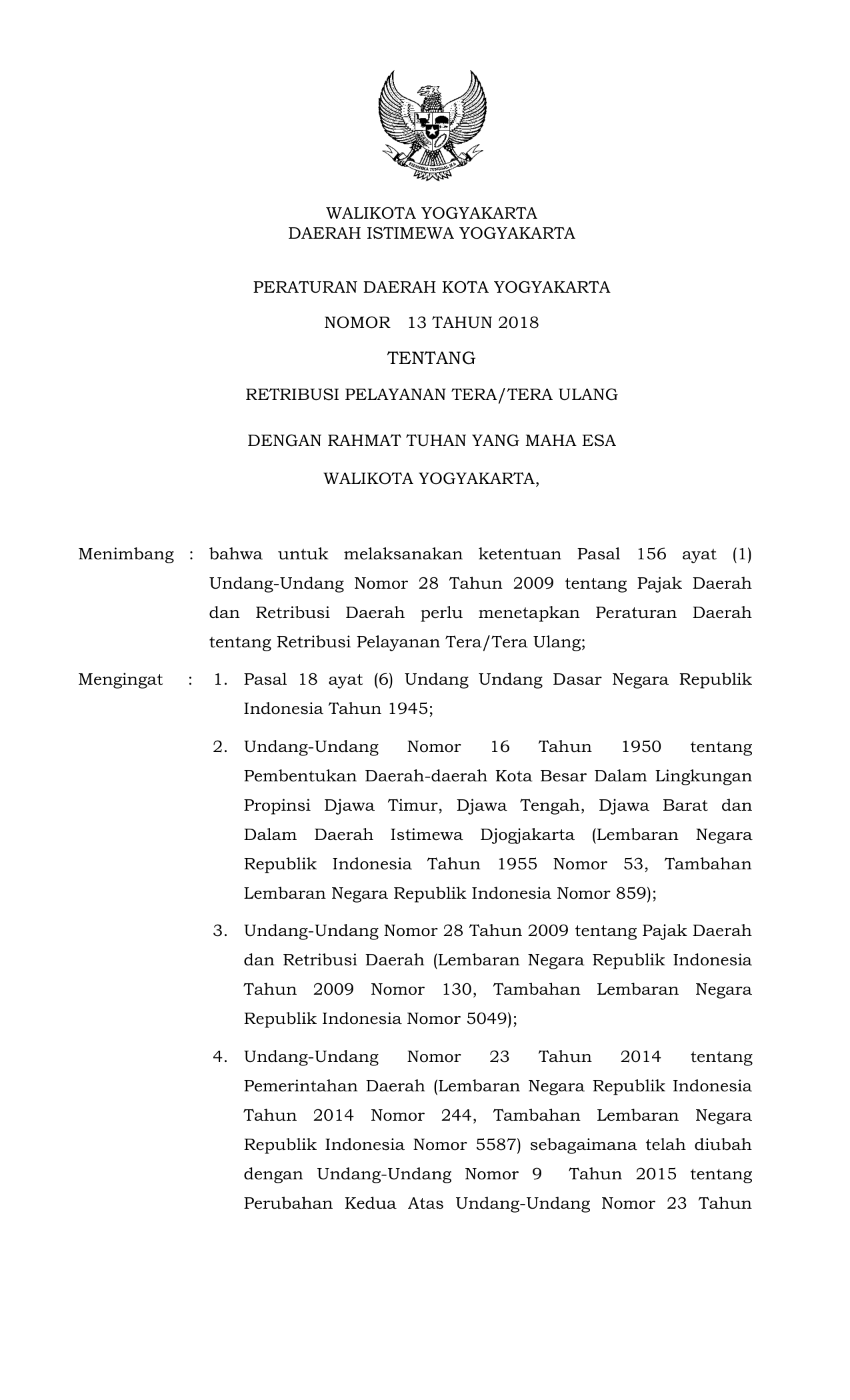 PERDA Nomor 13 Tahun 2018 | Peraturan Daerah Nomor 13 Tahun 2018 tentang Peraturan Daerah Kota Yogyakarta No. 13 Tahun 2018 tentang Retribusi Pelayanan Tera/Tera Ulang