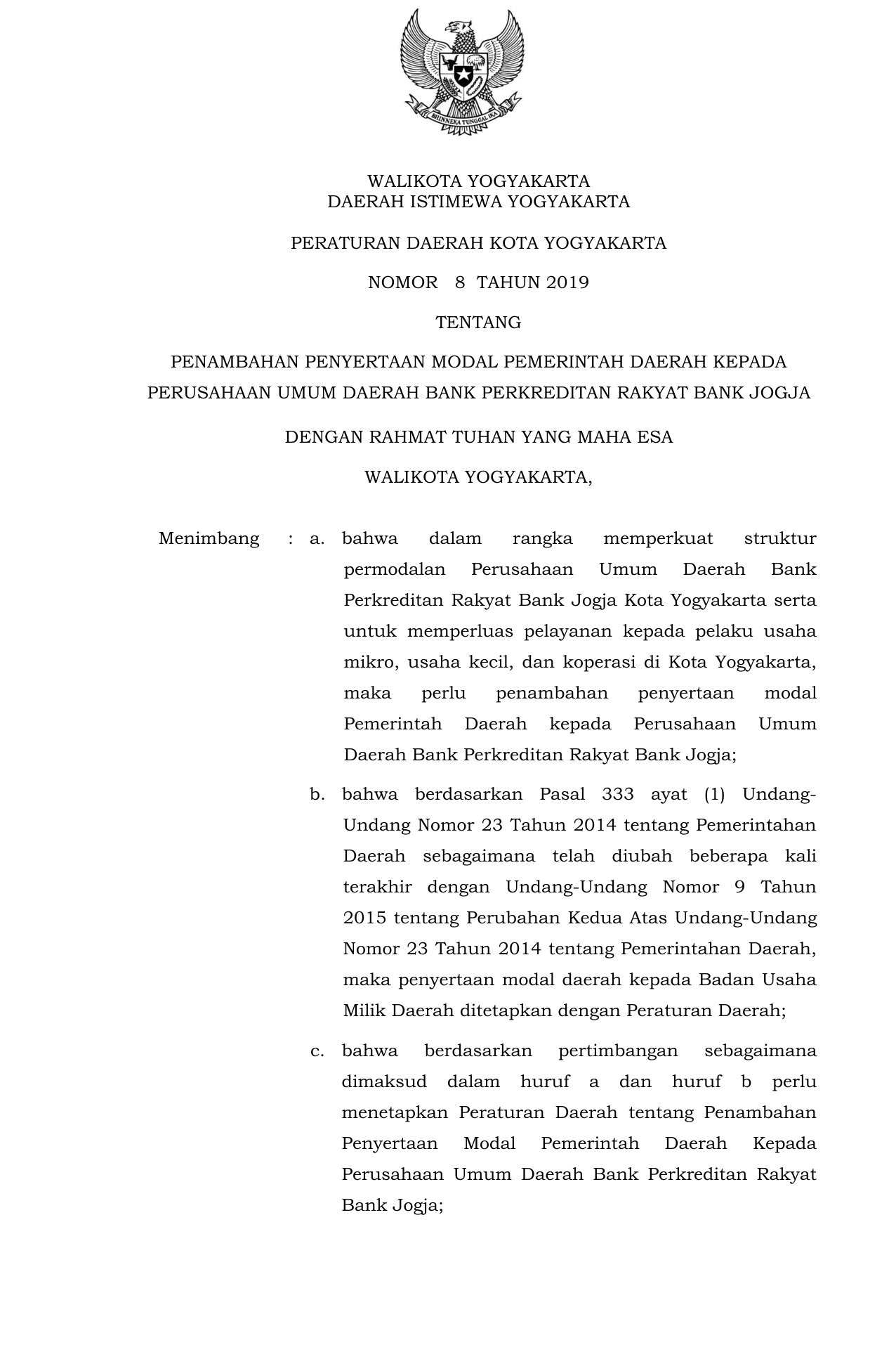 PERDA Nomor 8 Tahun 2019 | Peraturan Daerah Nomor 8 Tahun 2019 tentang Peraturan Daerah Kota Yogyakarta No. 8 Tahun 2019 tentang Penambahan Penyertaan Modal Pemerintah Daerah Kepada Perusahaan Umum Daerah Bank Perkreditan Rakyat Bank Jogja