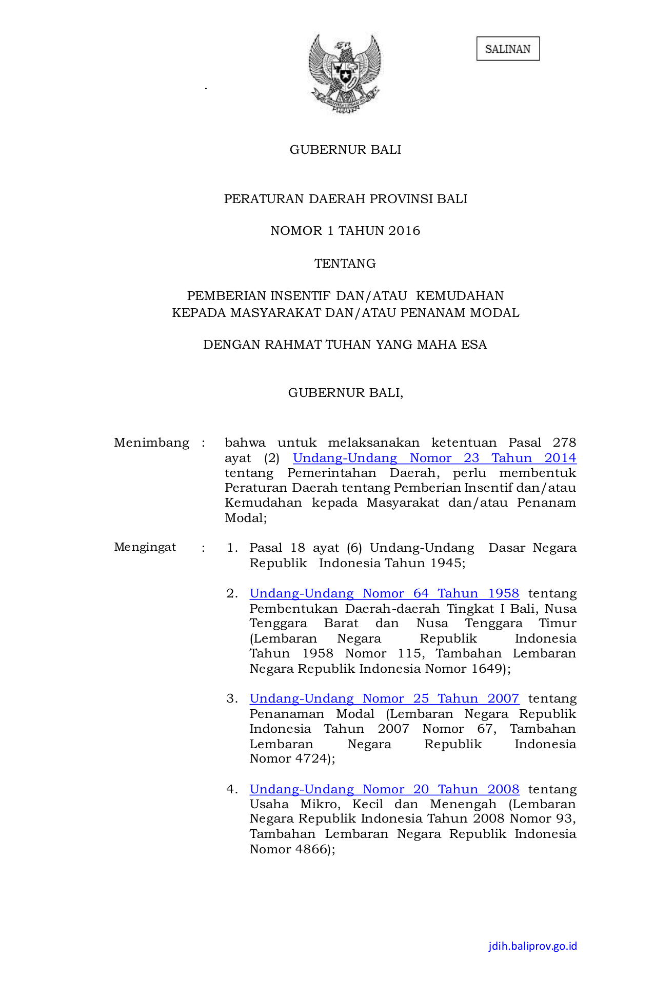 PERDA Nomor 1 Tahun 2016 | Peraturan Daerah Nomor 1 Tahun 2016 tentang PEMBERIAN INSENTIF DAN/ATAU KEMUDAHANKEPADA MASYARAKAT DAN/ATAU PENANAM MODAL