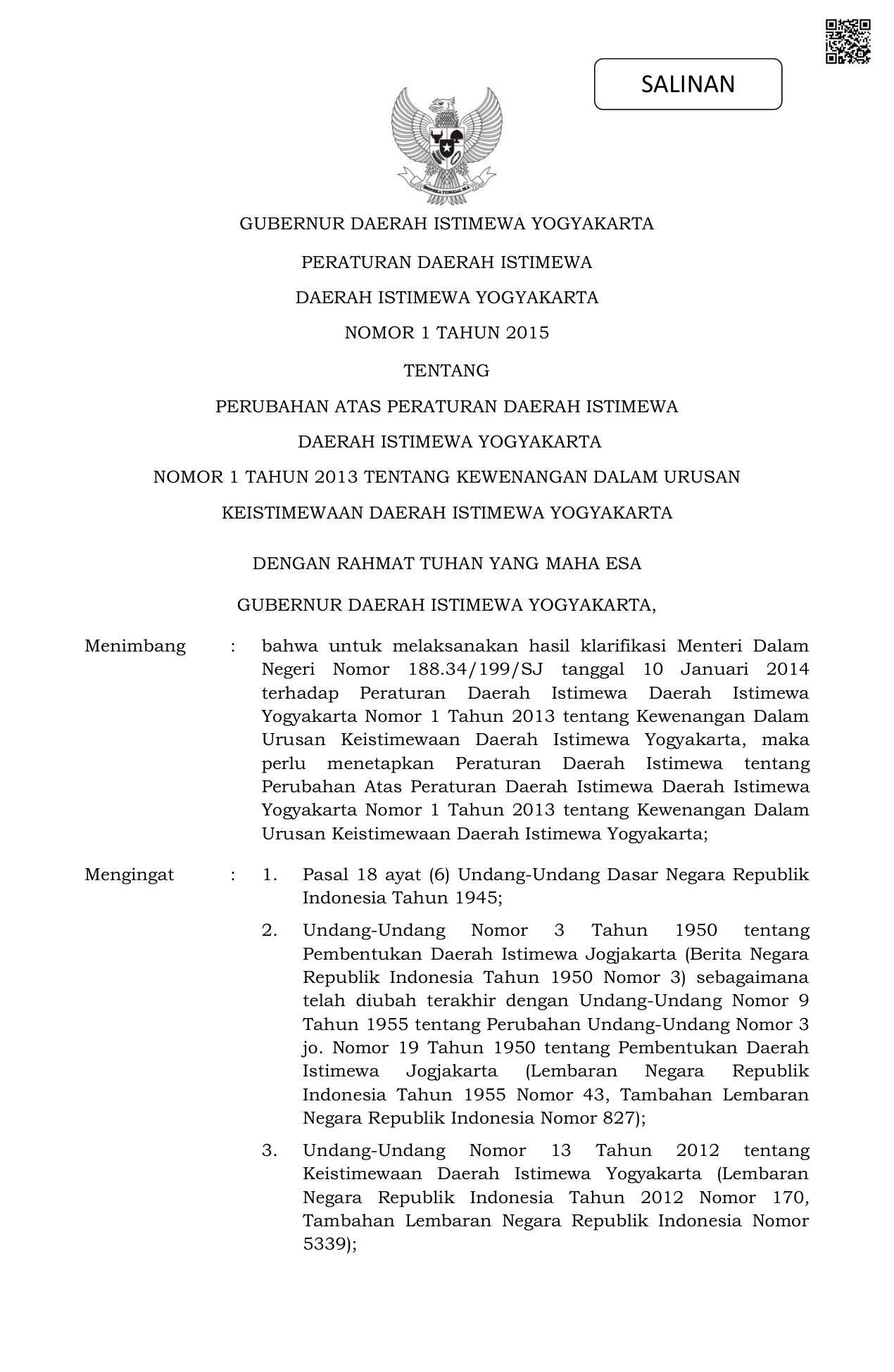PERDA Nomor 1 Tahun 2015 | Peraturan Daerah Nomor 1 Tahun 2015 tentang PERATURAN DAERAH ISTIMEWA DAERAH ISTIMEWA YOGYAKARTA NOMOR 1 TAHUN 2015 TENTANG PERUBAHAN ATAS PERATURAN DAERAH ISTIMEWA DAERAH ISTIMEWA YOGYAKARTA NOMOR 1 TAHUN 2013 TENTANG KEWENANGAN DALAM URUSAN KEISTIMEWAAN DAERAH ISTIMEWA YOGYAKARTA
