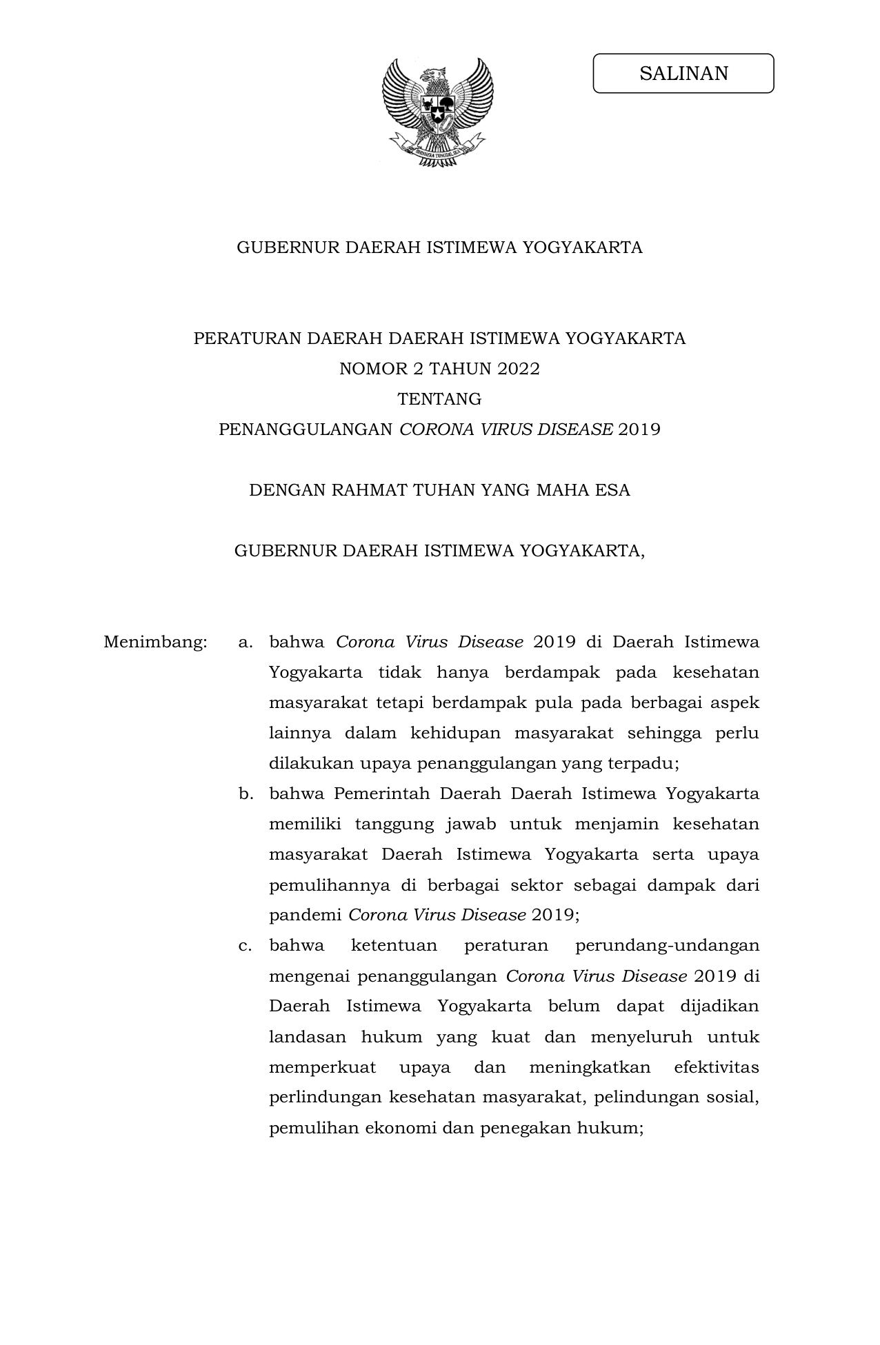 PERDA Nomor 2 Tahun 2022 | Peraturan Daerah Nomor 2 Tahun 2022 tentang Peraturan Daerah Daerah Istimewa Yogyakarta Nomor 2 Tahun 2022 Tentang Penanggulangan Corona Virus Disease 2019