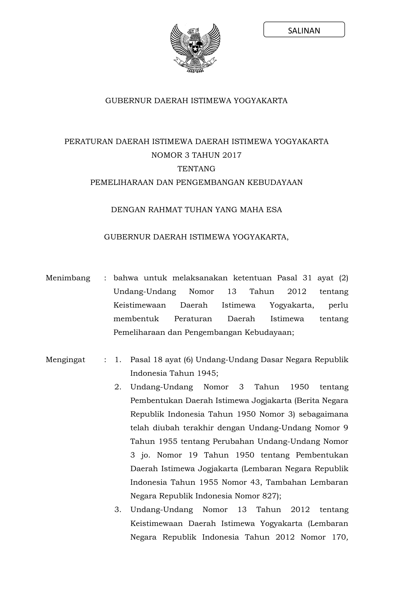 PERDA Nomor 3 Tahun 2017 | Peraturan Daerah Nomor 3 Tahun 2017 tentang PERATURAN DAERAH ISTIMEWA DAERAH ISTIMEWA YOGYAKARTA NOMOR 3 TAHUN 2017 TENTANG PEMELIHARAAN DAN PENGEMBANGAN KEBUDAYAAN