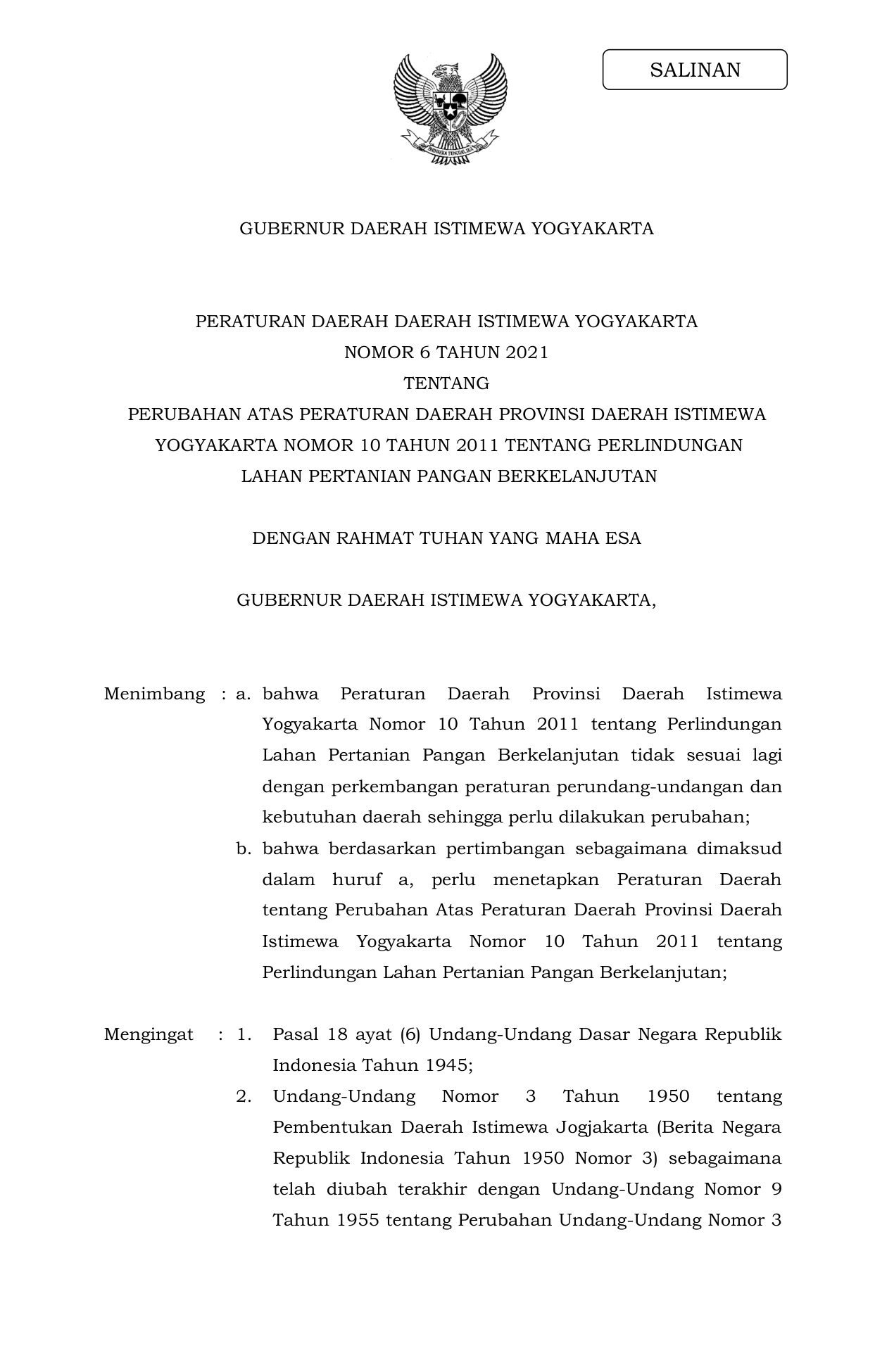 PERDA Nomor 6 Tahun 2021 | Peraturan Daerah Nomor 6 Tahun 2021 tentang Peraturan Daerah Daerah Istimewa Yogyakarta Nomor 6 Tahun 2021 Tentang Perubahan Atas Peraturan Daerah Daerah Istimewa Yogyakarta Nomor 10 Tahun 2011 Tentang Perlindungan Lahan Pertanian Pangan Berkelanjutan