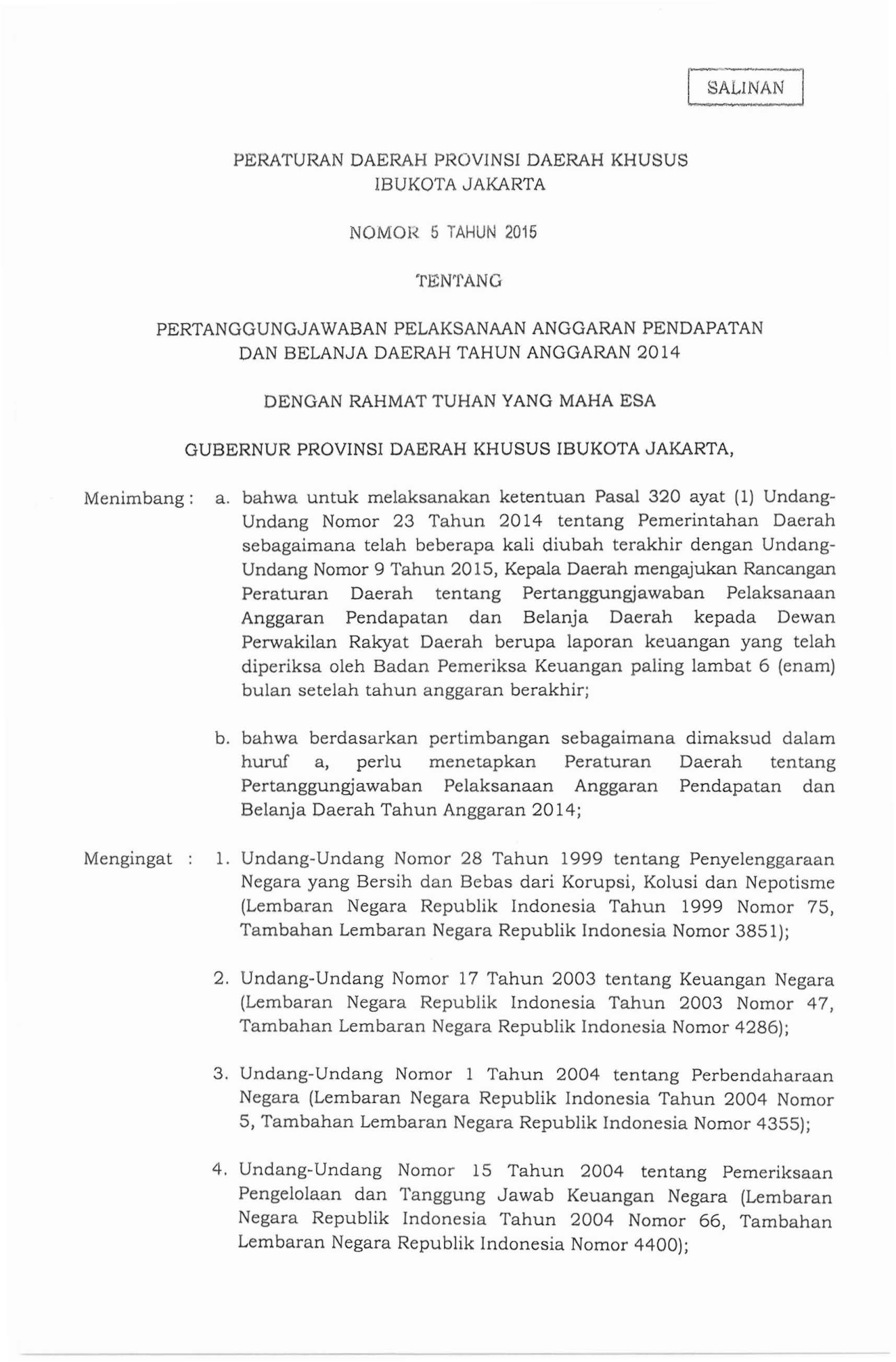 PERDA Nomor 5 Tahun 2015 | Peraturan Daerah Nomor 5 Tahun 2015 tentang PERTANGGUNGJAWABAN PELAKSANAAN ANGGARAN PENDAPATAN DAN BELANJA DAERAH TAHUN ANGGARAN 2014