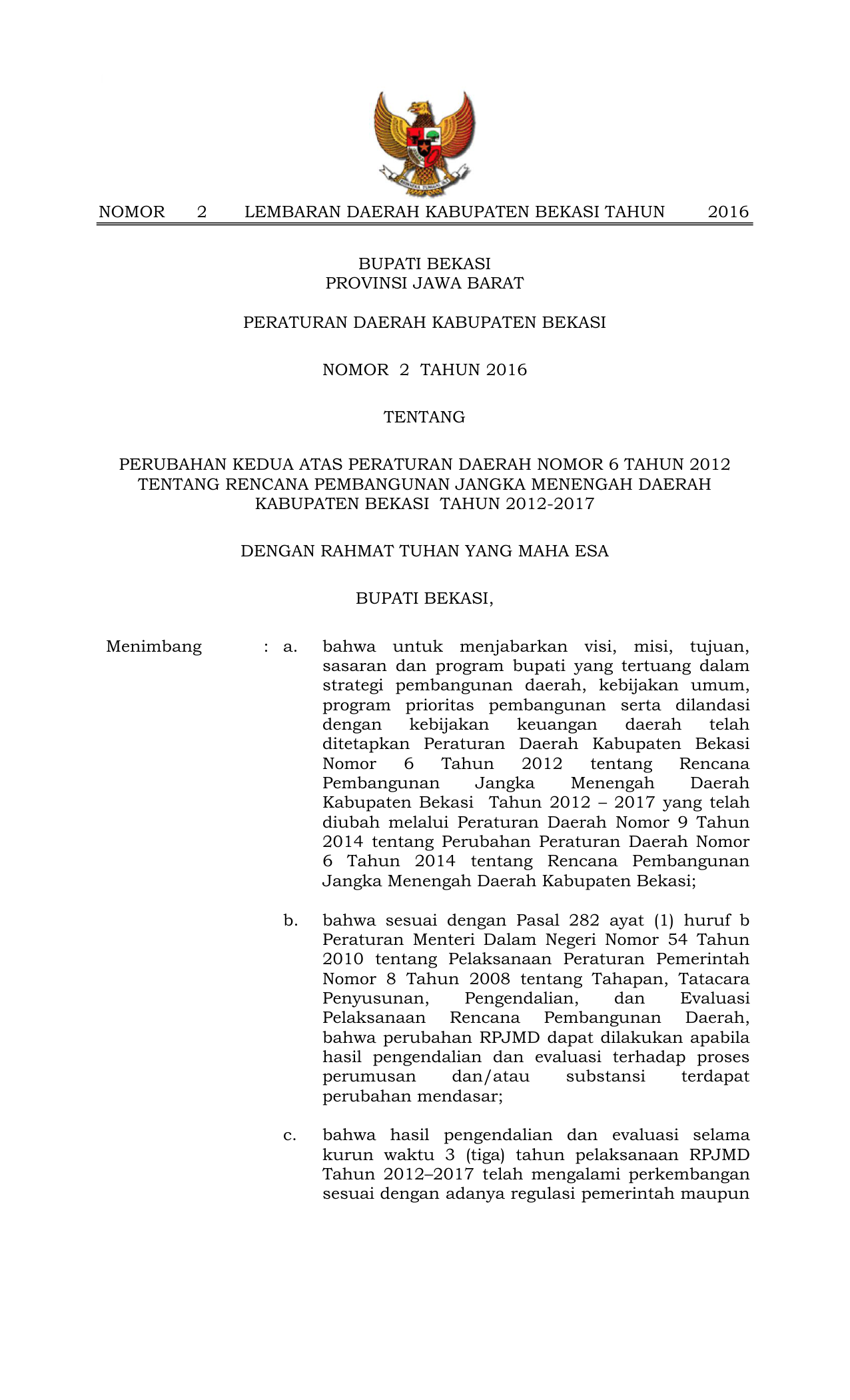 NOMOR REGISTRASI PERATURAN DAERAH KABUPATEN BEKASI PROVINSI JAWA BARAT, NOMOR : 2/2016.
